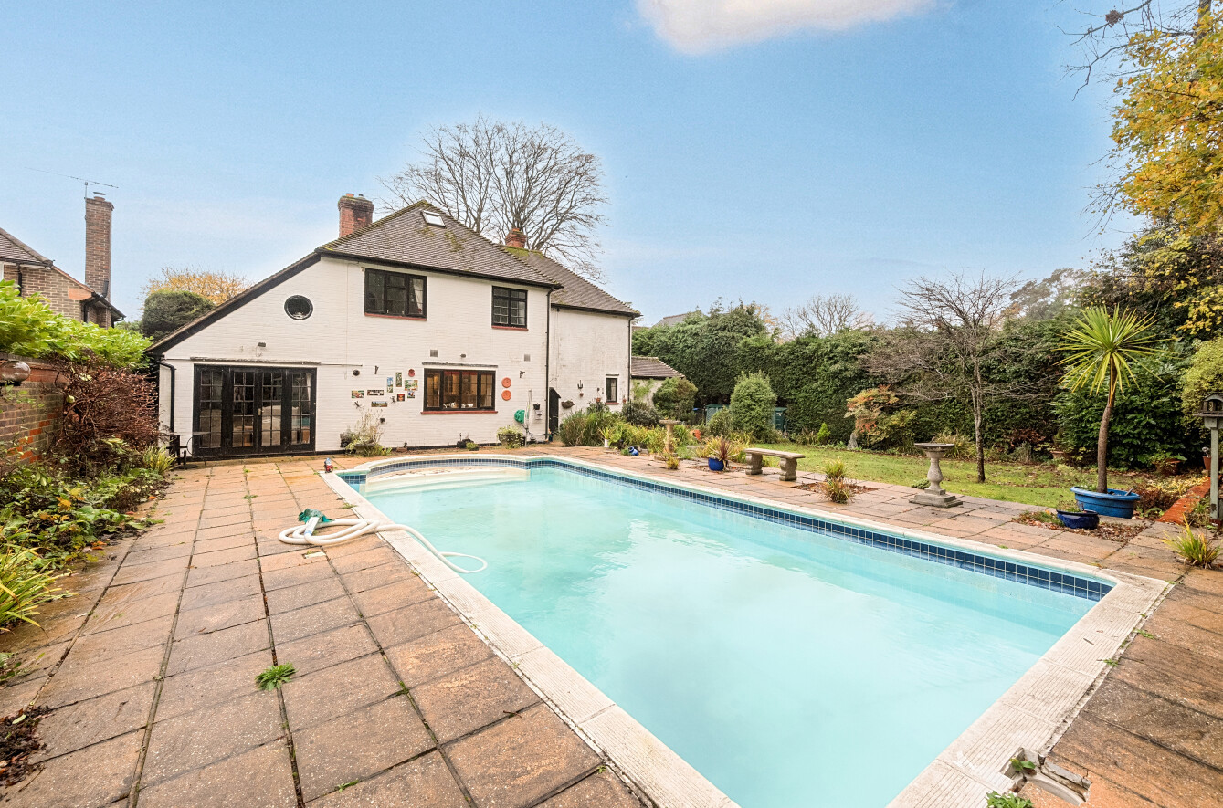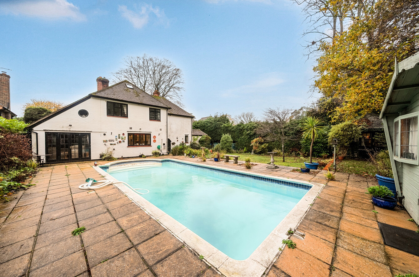 Set in the superb and highly sought-after location of Hook Heath, Woking, this delightful detached home blends countryside tranquillity with excellent convenience. Offering a generous 2,411 sq ft of living space, the property includes four bedrooms, four reception rooms and two bathrooms, making it ideal for a growing family. While some modernisation would enhance its full potential, the home already benefits from wonderfully versatile living areas and an abundance of natural light.The well-tended garden, spacious patio and inviting swimming pool create a perfect setting for outdoor relaxation and summer entertaining. Additional features such as off-street parking and a useful outbuilding add practicality to this peaceful retreat.Combining charm, space and an exceptional setting, this property presents a rare opportunity to craft your ideal home in one of Woking's most prestigious areas.