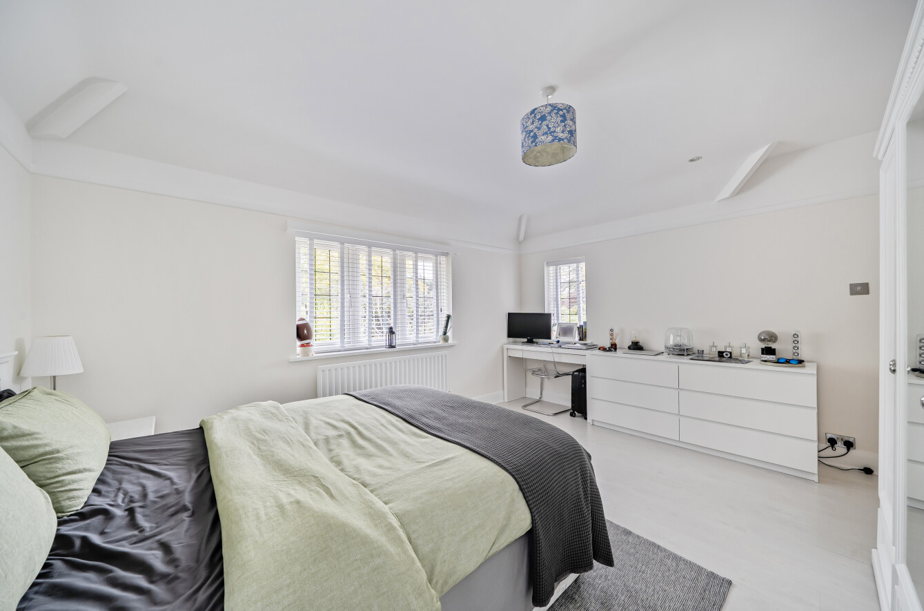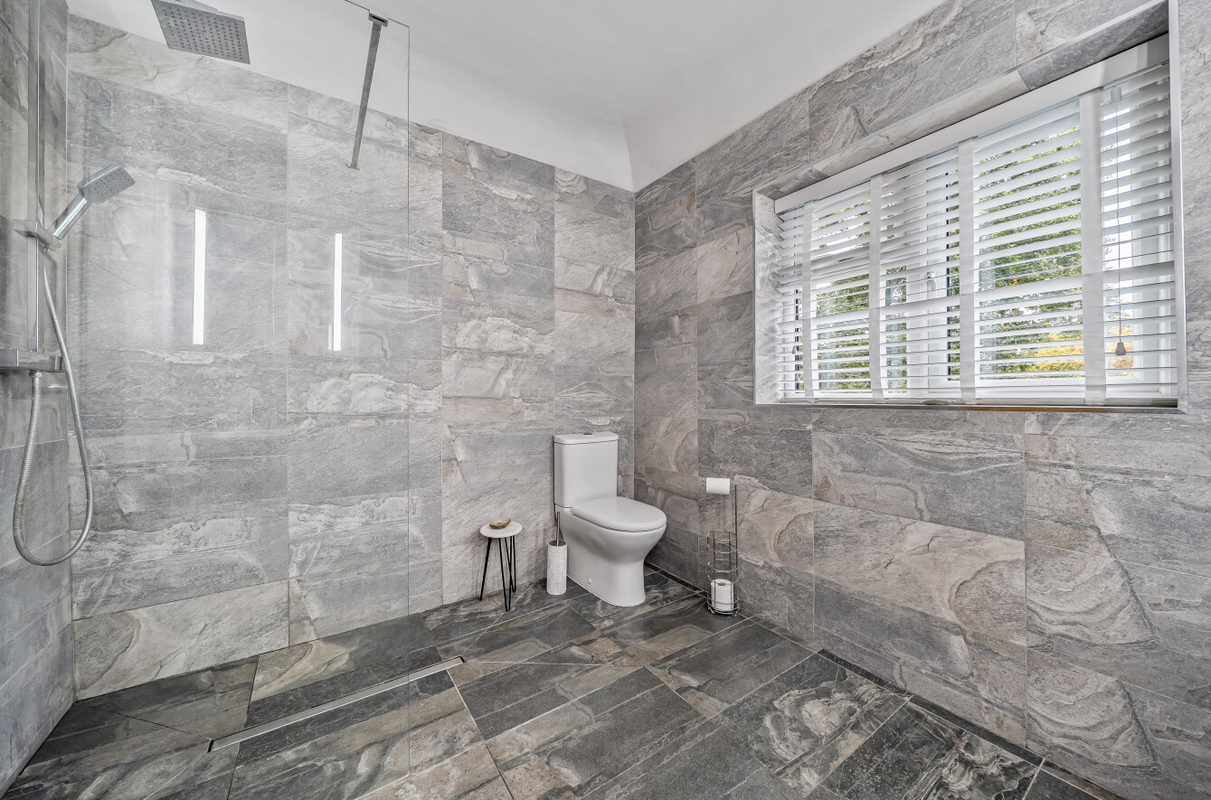 Upstairs, the immaculate pared-back aesthetic echoes through a series of five double bedrooms all ideally suited for the flexibility a growing household needs. An enviable principal suite with a walk-in dressing room has the perfect spot for a chaise long within bay window that give the perfect vantage point to admire the gardens. Teenagers will undoubtedly love the second bedroom suite with its dressing room and sliding doors to a Juliet balcony, while a third suite has ample storage within fitted wardrobes. With the decadent rich grey tones of their tiles, each of the luxury en suite wet and bath rooms prompts an indulgently deluxe finishing touch.
