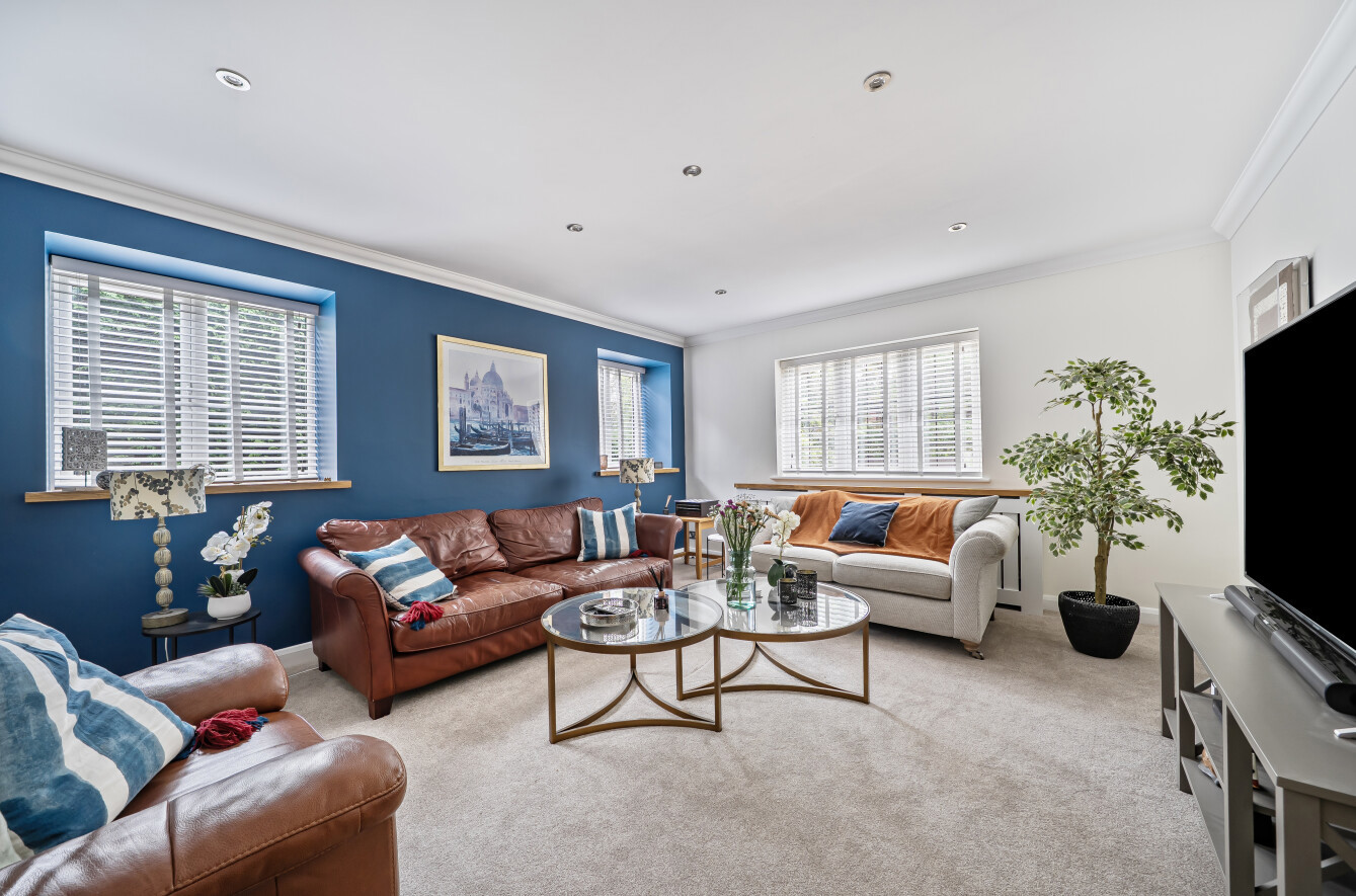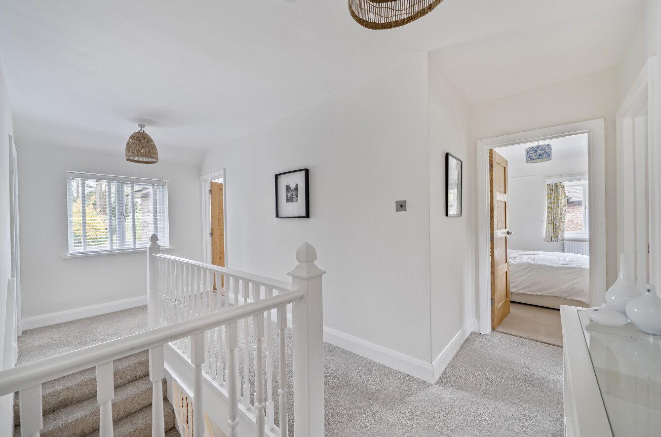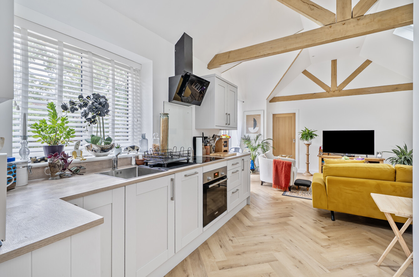 Sitting back behind the sweeping curve of an in/out driveway, a handsome double aspect facade remains true to the original architecture and character of the property. Inside, the warming timber tones of exposed beams and a herringbone floor stretch out above and beneath you in a wonderfully large central entrance hall that immediately hints at the fluidity of the array of sun-kissed rooms unfolding all around. To either side double aspect living and study rooms are impeccably styled and sized for modern 21st century life. Adaptable to your needs and with plush grey carpeting underfoot, while an accent wall of Oxford blue gives a dash of colour to the living room, fitted cabinetry adorns the study where a glazed door makes it temptingly easy to step out into the fresh air.