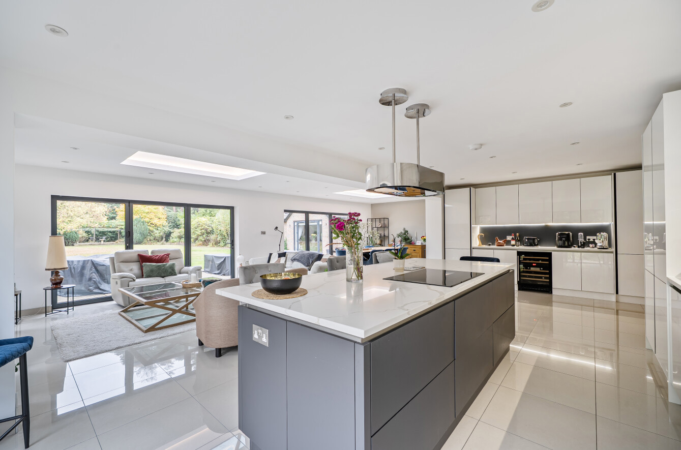 Explore further and to the rear you'll discover the herringbone floors flowing seamlessly into an additional sitting room that generates a supremely relaxed and inviting space to spend time together. An expansive wall of bi-fold doors allows utterly idyllic garden views to be carried through whilst seamlessly blending the outside and in, and fitted cabinetry is discreetly positioned to give ample storage without encroaching on the aesthetic. However, when it comes to providing a memorable wow factor it will undoubtedly be the magnificent design of the double aspect open plan kitchen/breakfast and dining room that captures and holds your attention for all the right reasons. Simply stunning and bathed in sunlight, this superior space is both spacious and tastefully contemporary. A polished tiled floor perfectly bounces a wealth of light from roof lanterns, tall picture windows and an expanse of bi-fold and sliding doors around an impressively considered layout that gives a sublime interplay with the gardens. The sleek minimalism of the vast kitchen's clean lines enhances the sense of space further still and a brilliantly deep central island with bar stool seating subtly unifies and delineates it from the spacious dining, seating and family areas. First class specification integrated appliances such as eye-level tower ovens, a wine fridge and induction hob offer every convenience and the design provides the opportunity to have a dedicated coffee and cocktail station.