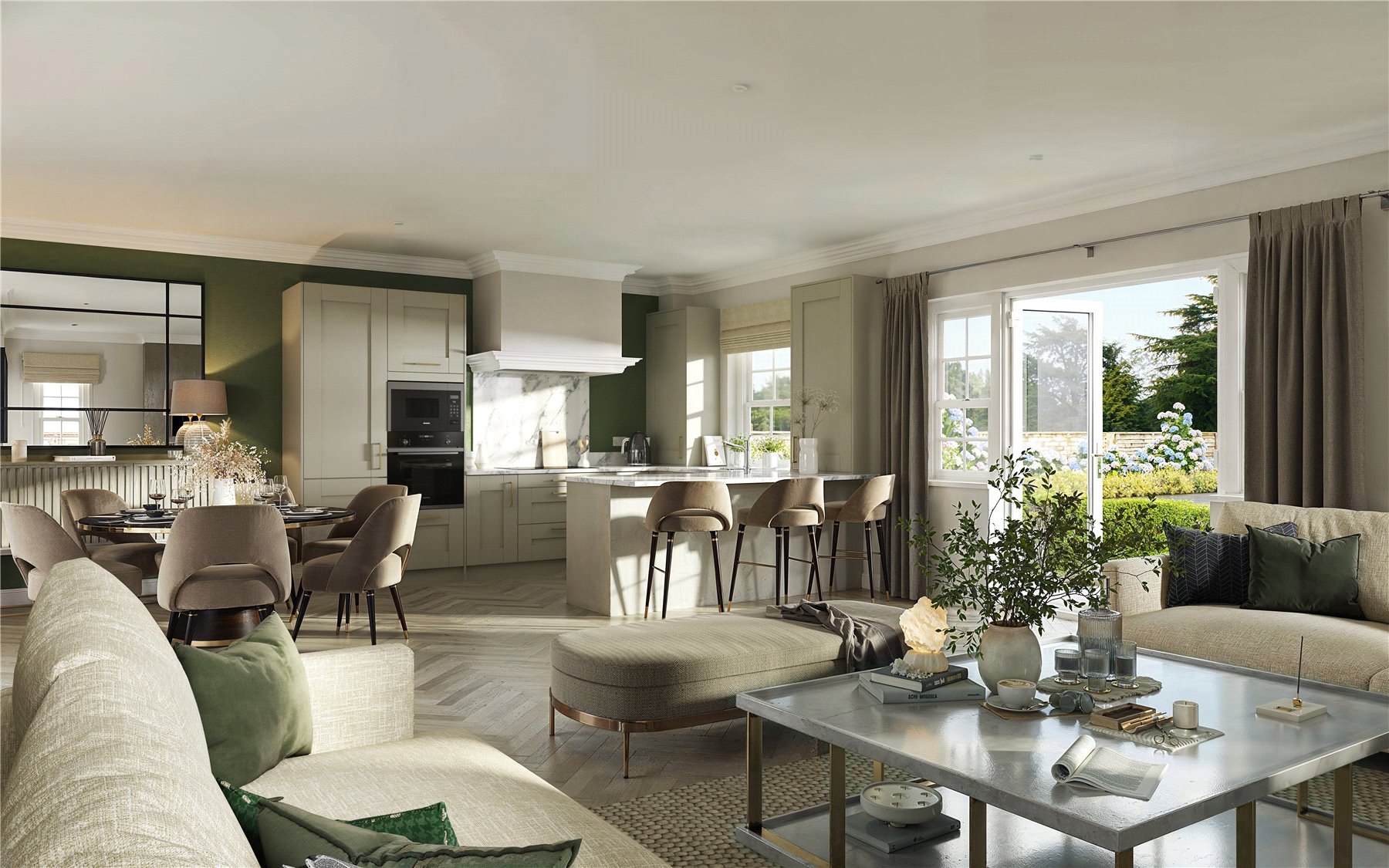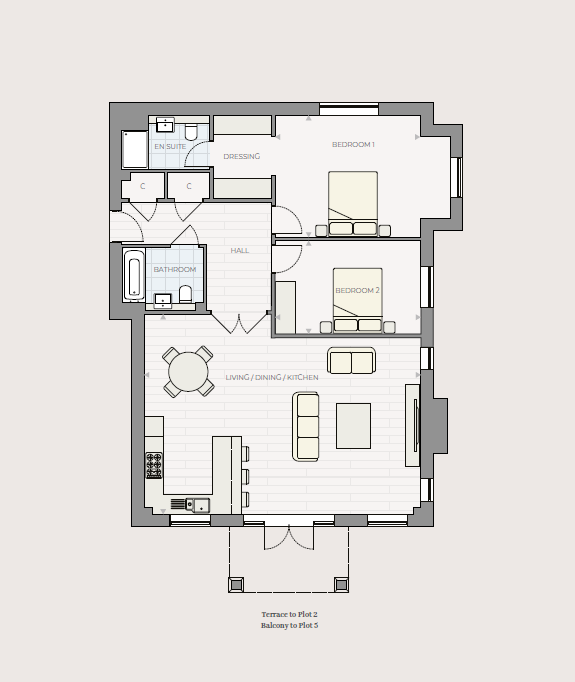 - Open-plan kitchen/living/dining space with private terrace
