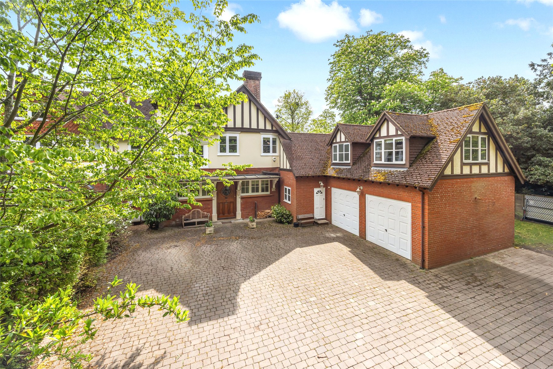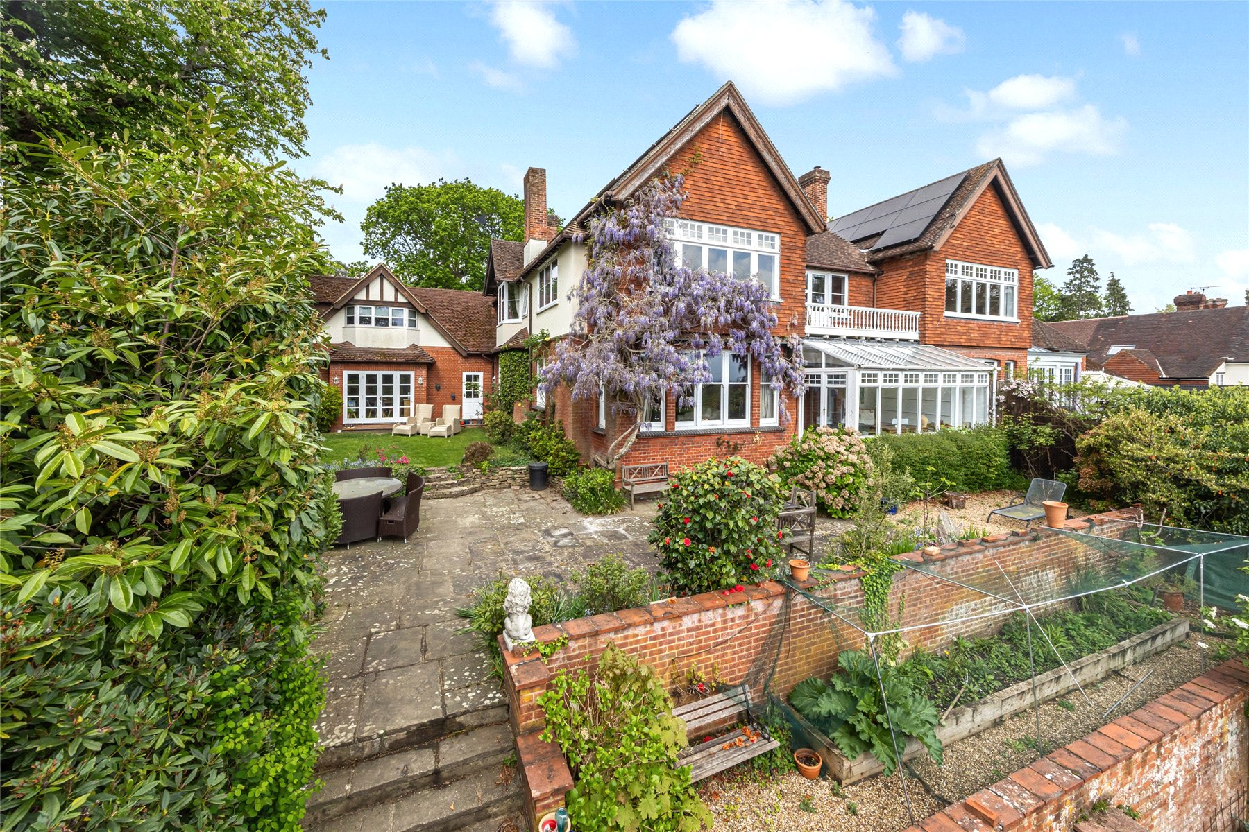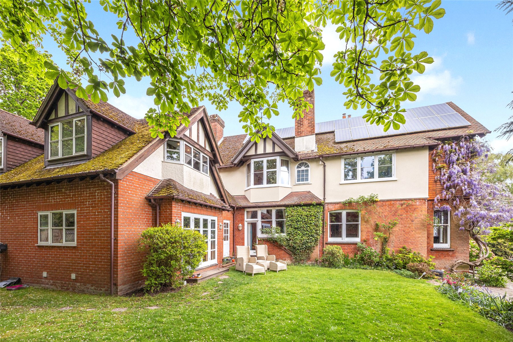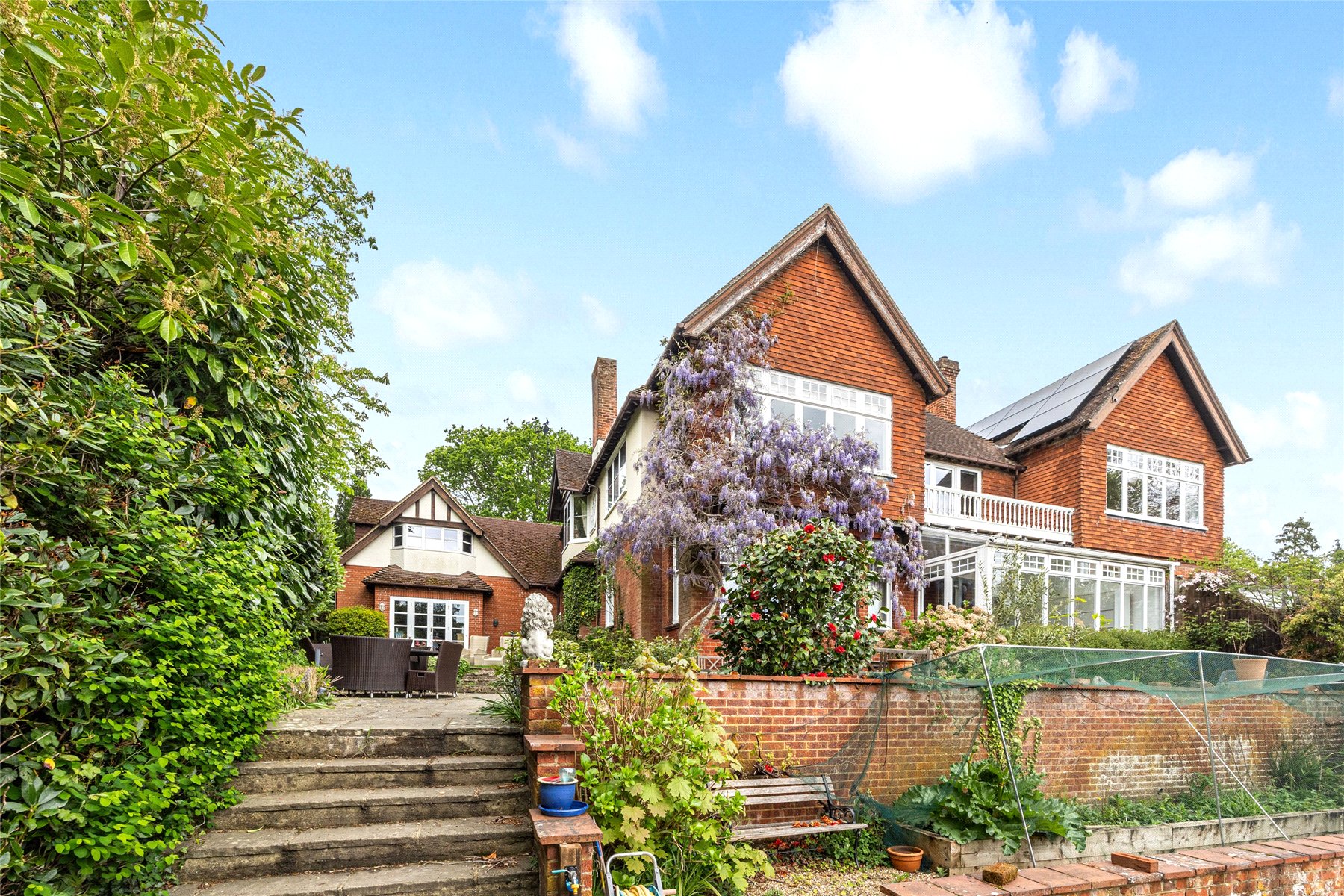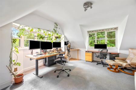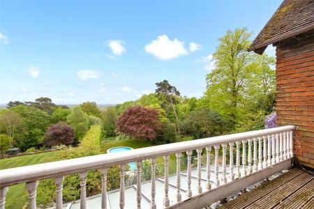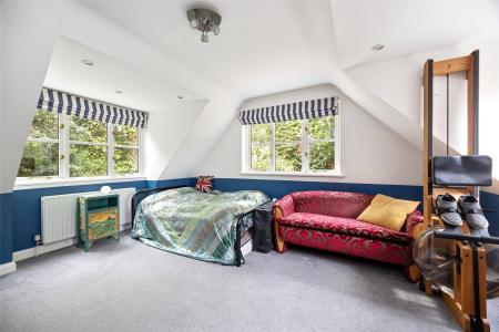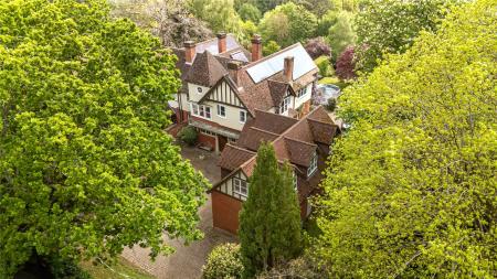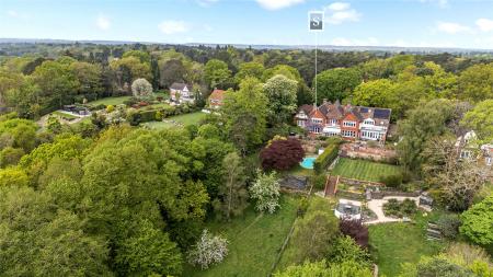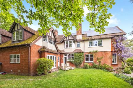 Set within approximately 0.8 acres of beautifully established gardens, with the option to acquire a further 0.6 acres of private woodland., Nine Oaks is an exceptional six-bedroom wing of a character residence, discreetly positioned off one of Hook Heaths most prestigious private roads. Full of original charm yet sensitively enhanced over the years, this substantial family home offers a rare opportunity to enjoy both space and seclusion with stunning panoramic views across Guildford.