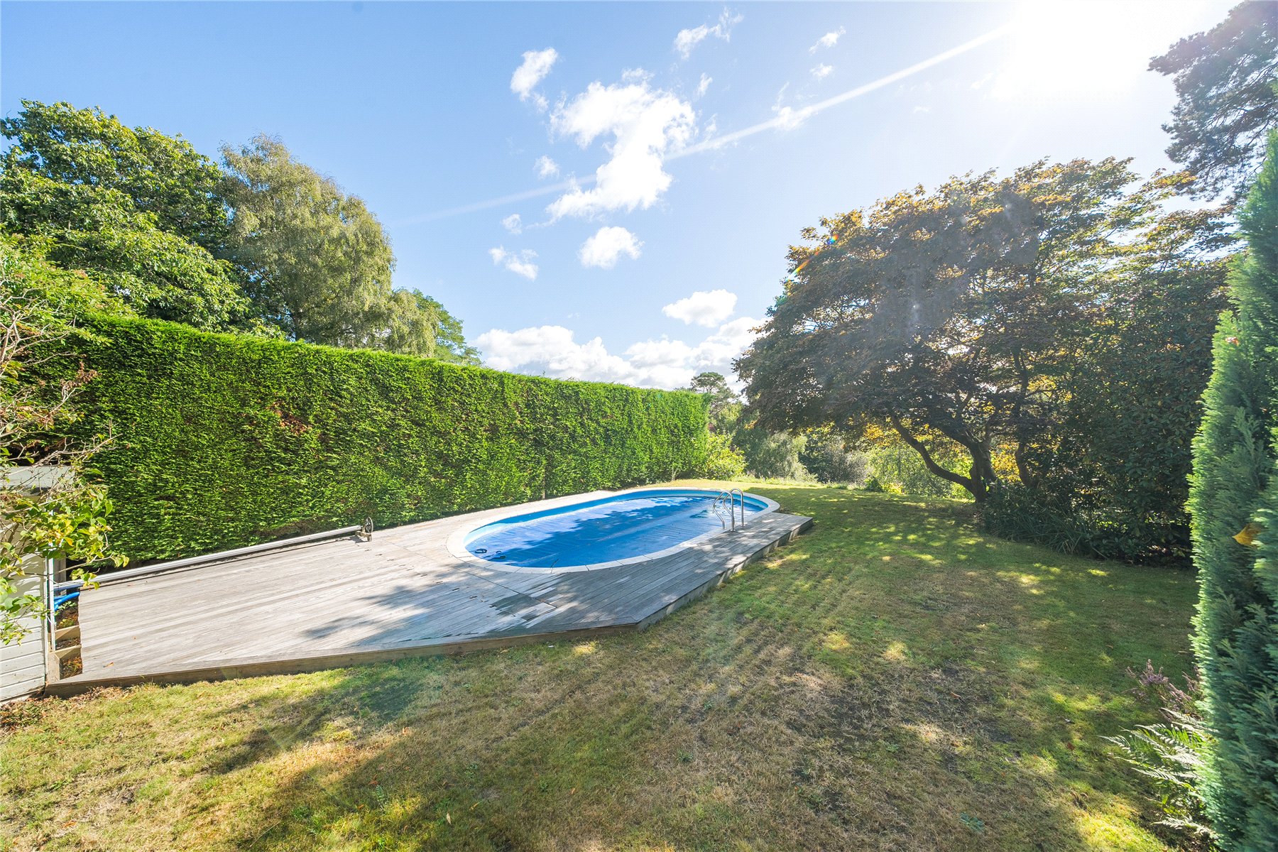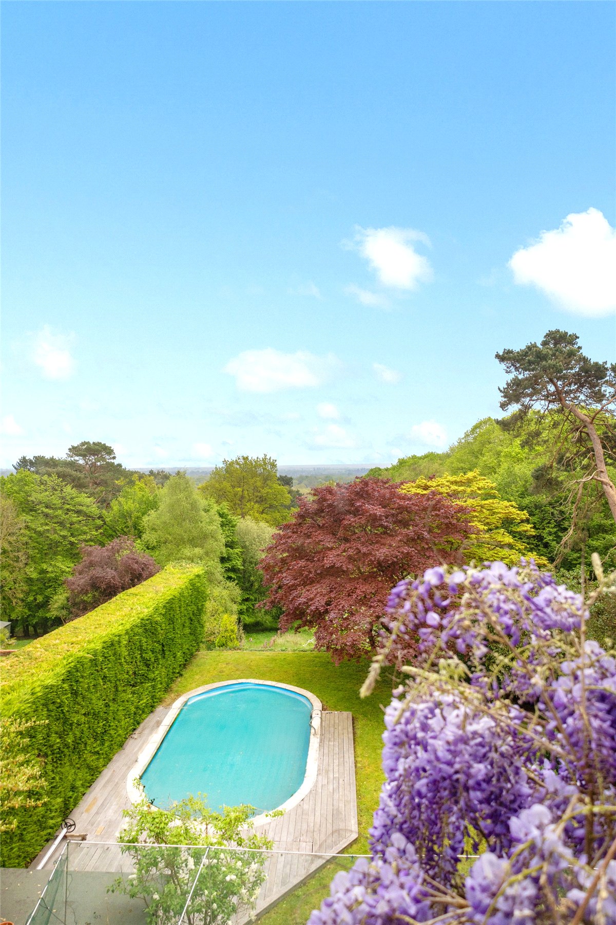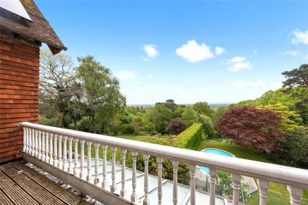 Externally, Nine Oaks truly shines. The private plot, extending to around 0.8 of an acre, offers expansive lawns, mature planting, and breathtaking views stretching out towards Guildford. A swimming pool provides a wonderful lifestyle feature, while the detached double garage and ample off-street parking ensure practicality and convenience. Beyond the garden a small private woodland area on a seperate title measures 0.6 acres.