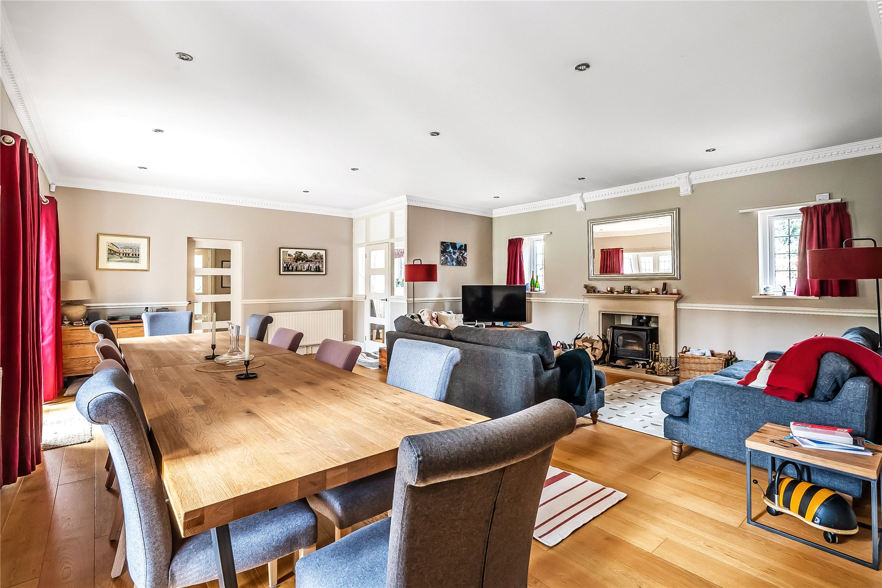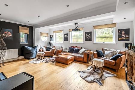 Four sizable reception rooms include the formal drawing/dining room with Bath stone fireplace and oak wood floor along with a modern log burner, double aspect family room, great size playroom and the luxurious kitchen that a locally renowned company has fitted.