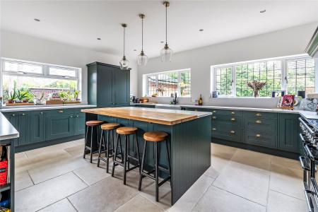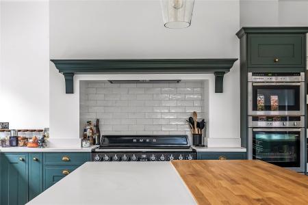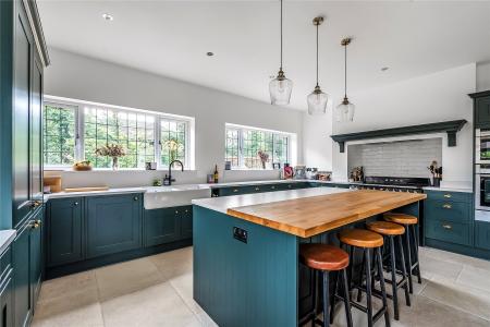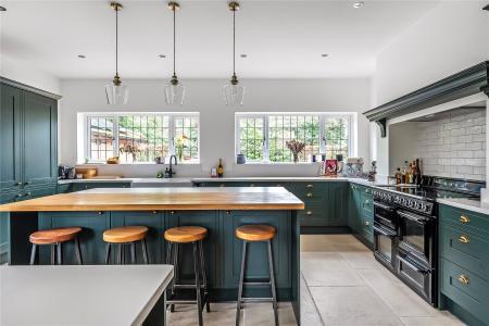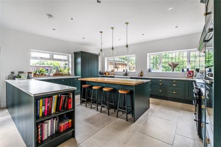 The kitchen has been tastefully designed with ample worktop space, integrated appliances, hot and cold Quooker tap, and a large kitchen island with a wooden worktop finish.
