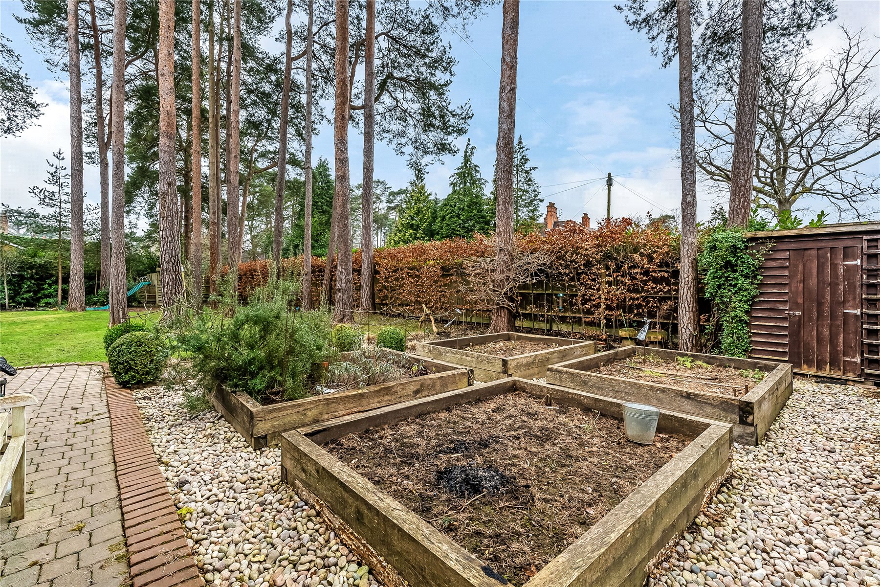 Enclosed on all sides this south facing garden comprises of large lawn area surrounded by woodland planting, two block paved patios, a vegetable garden with raised beds and herbaceous borders, a children's play area, outside lights, two outside taps and side access gates to both sides of the property. The garden provides a good degree of privacy and seclusion being surrounded by new close board fencing which has been softened by mature hedging. The vendor has also installed solar panels located on the garage roof.