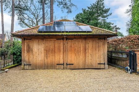 Outside a large welcoming frontage begins with the in and out driveway, approached via automated gates. Ample parking is coupled with an attractive oak beam double garage with automated doors. This is complete with light, multiple power points and also a large adjoining bicycle shed at the rear. Good size side access leads to the rear garden.