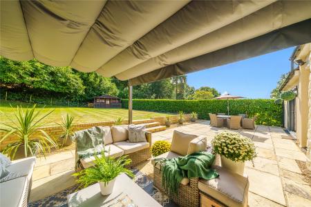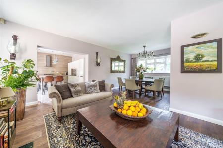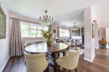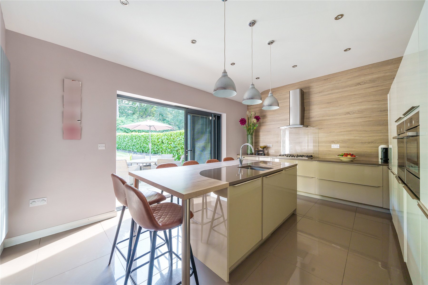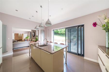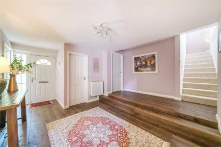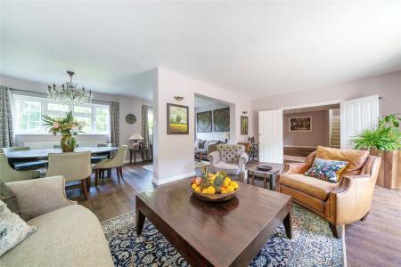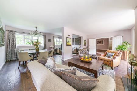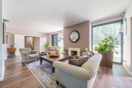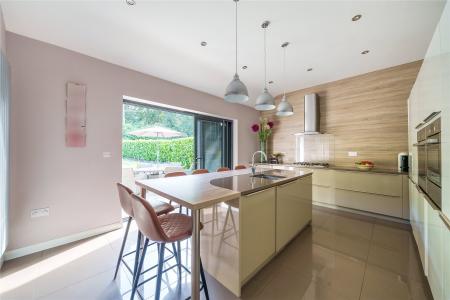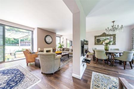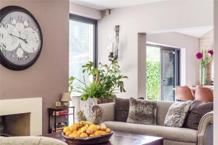 Once inside youll discover a cleverly enhanced ground floor superbly designed to give delineation from the exceptional living spaces and a bedroom wing. With tastefully chosen aesthetics that pair soft muted tones with the rich warming balance of engineered oak floors, a large central entrance hall hints at of the sense of style and space that features throughout. Its generous dimensions unfold onto a spacious double aspect lounge/dining room thats delicately filled with natural light via bi-fold doors and a floor to ceiling picture window. The greenery of the gardens lends a wonderful backdrop to both the front and rear, whilst a contemporary fireplace sits within the clean lines of an accent chimney breast. The bi-fold doors engender an easy flowing extension of the room allowing daily life to filter out onto the extensive south-facing patio and the inspired design creates defined zones for a traditional seating and formal dining areas as well as a snug.