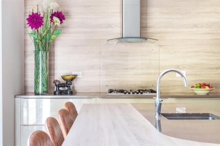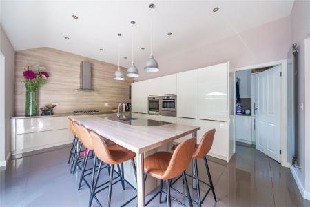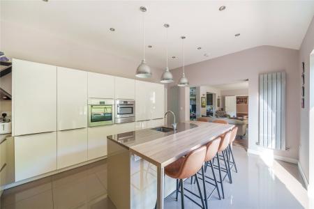A wide archway connects this hugely sociable space to the adjoining kitchen where further bi-fold doors tempt you outside for al fresco dining. Supremely well appointed, its streamlined cashmere cabinets are paired with sleek pull handles and topped with brown quartz that complements a feature wood panelled wall and polished tiled floor. Eye-level Bosch ovens are integrated within a bank of tall cabinets that supply a wealth of hidden storage, while a trio of hanging pendants illuminates a stylish central island with a fabulous L-shaped bar stool overhang. A fitted utility room extends out behind the kitchen hidden from view.