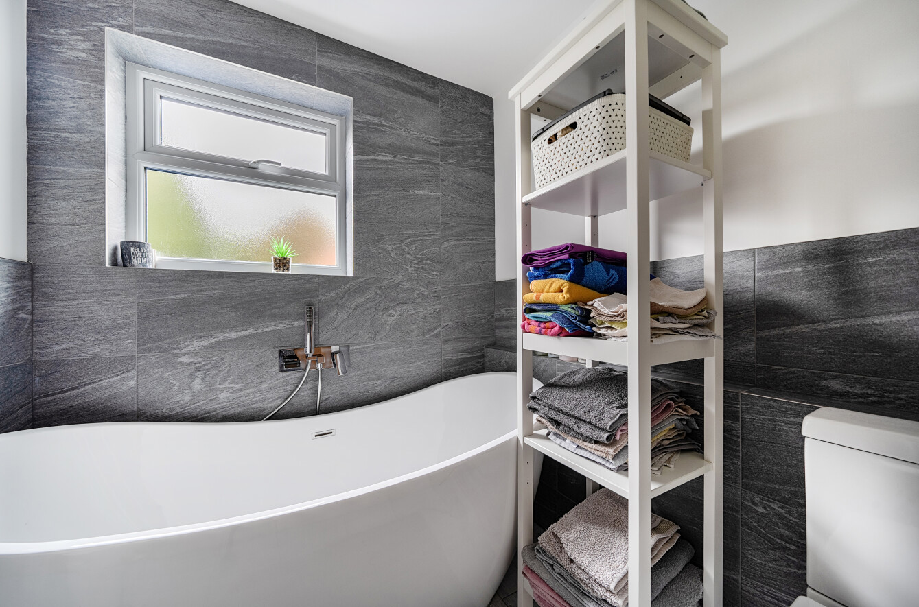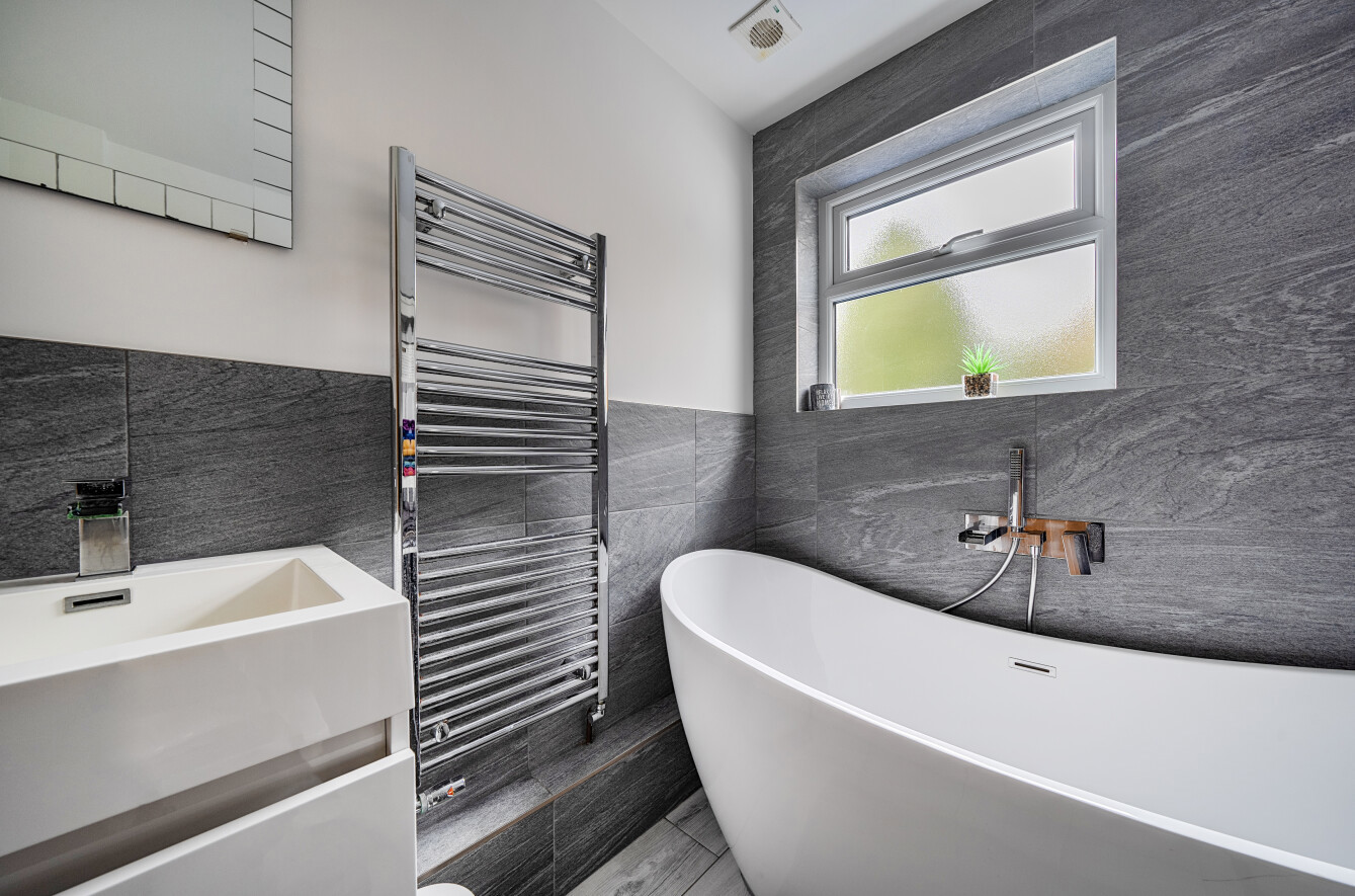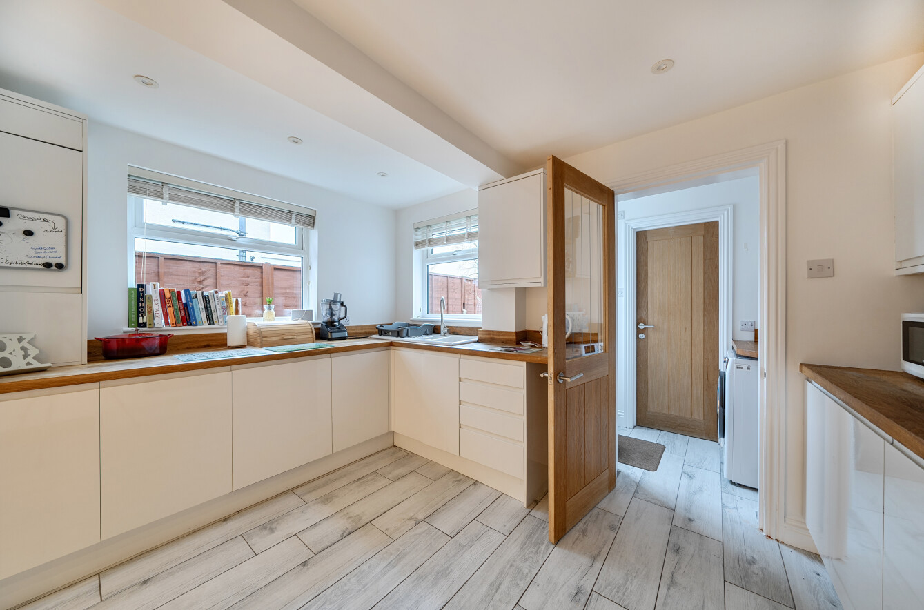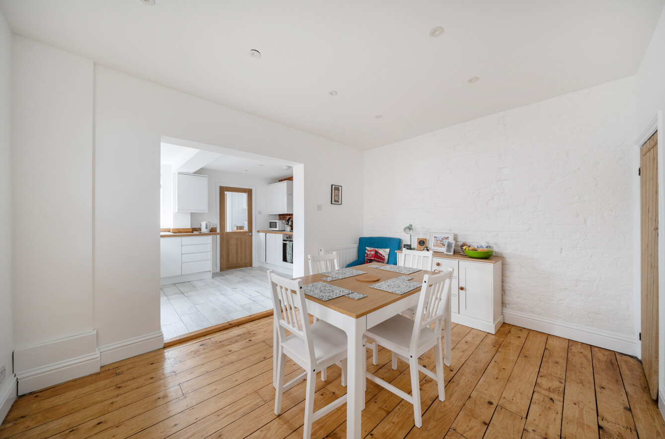 To the rear, the property has been thoughtfully extended to create an excellent dining room opening to the modern kitchen, ideal for entertaining and family living, with a pleasant outlook over the garden. The kitchen is well arranged with ample storage and worktop space and provides access to the rear garden. A modern ground floor bathroom, fitted with bath, basin and WC, completes the downstairs accommodation.