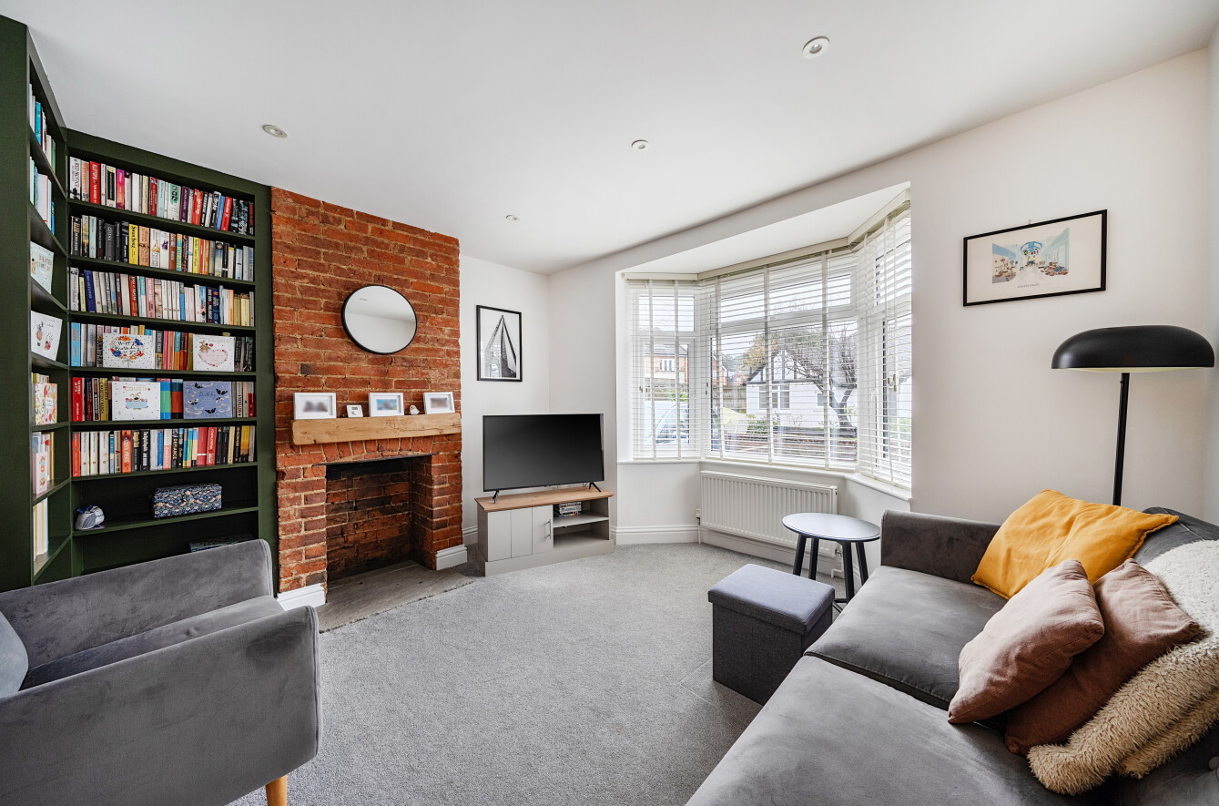 The ground floor provides a welcoming entrance hall with stairs to the first floor and access to the principal reception rooms. To the front, the bright and spacious living room features an attractive bay window, retaining the homes character feel with an exposed brick chimney.