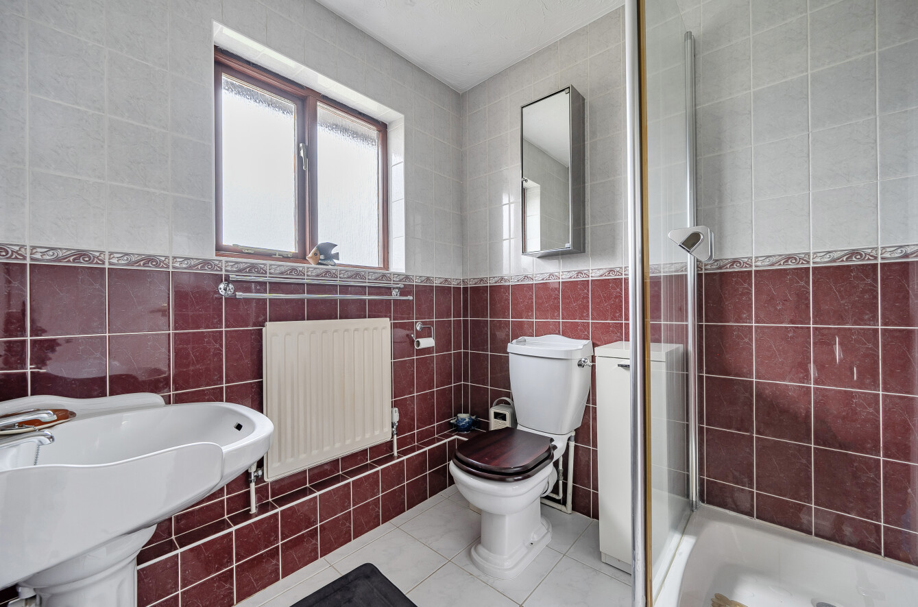 The ground floor is centred around a spacious dual-aspect living and dining room, providing ample space for both relaxation and entertaining. Double doors lead through to a bright conservatory, creating a seamless connection between the living space and the garden and offering a versatile additional reception area. The separate kitchen is well laid out with good worktop space and storage, while a downstairs cloakroom and internal access to the garage add further practicality.