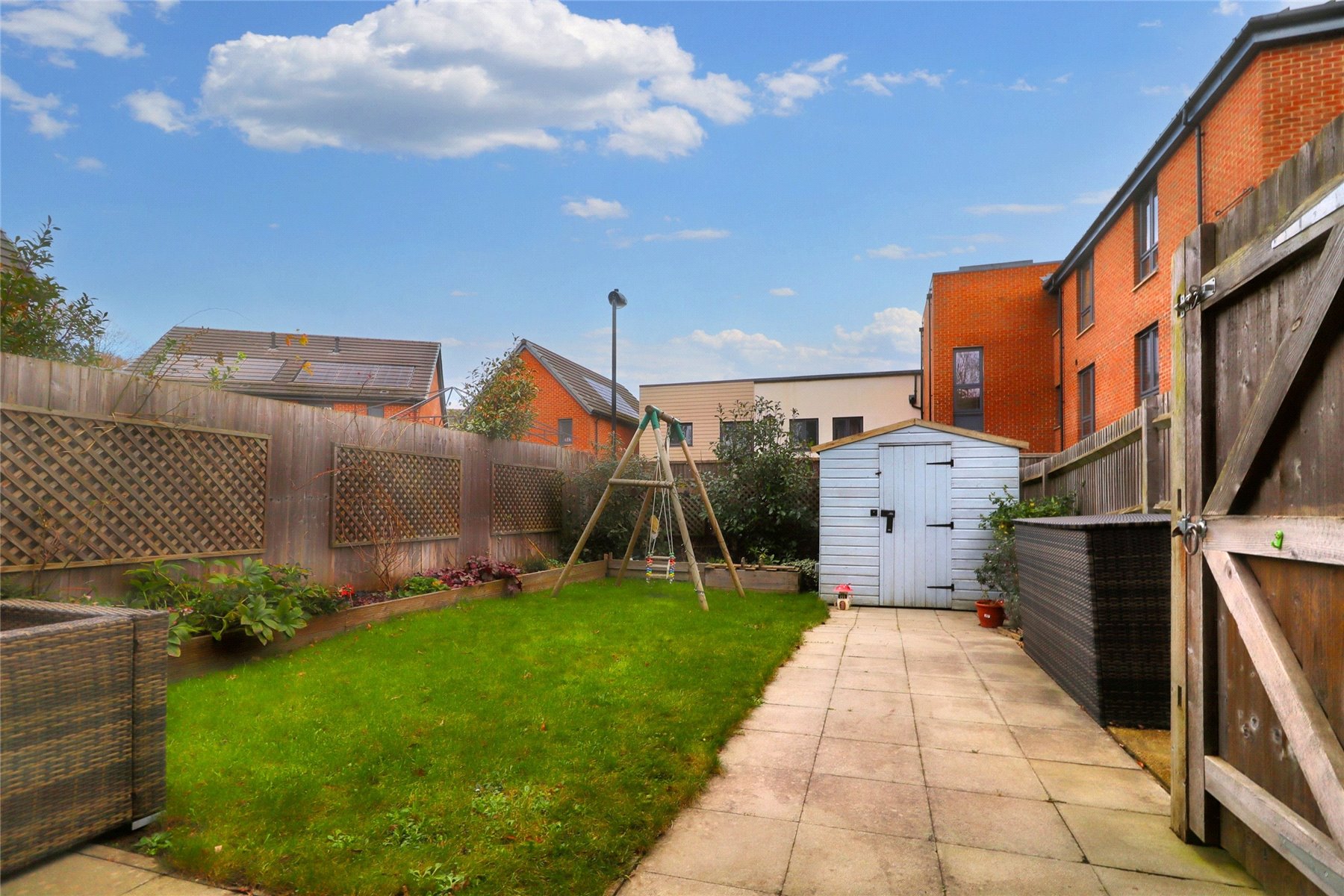 An enclosed garden is mainly laid to lawn with boxed flower beds, large patio area and timber storage shed. To the front there is parking for two cars.