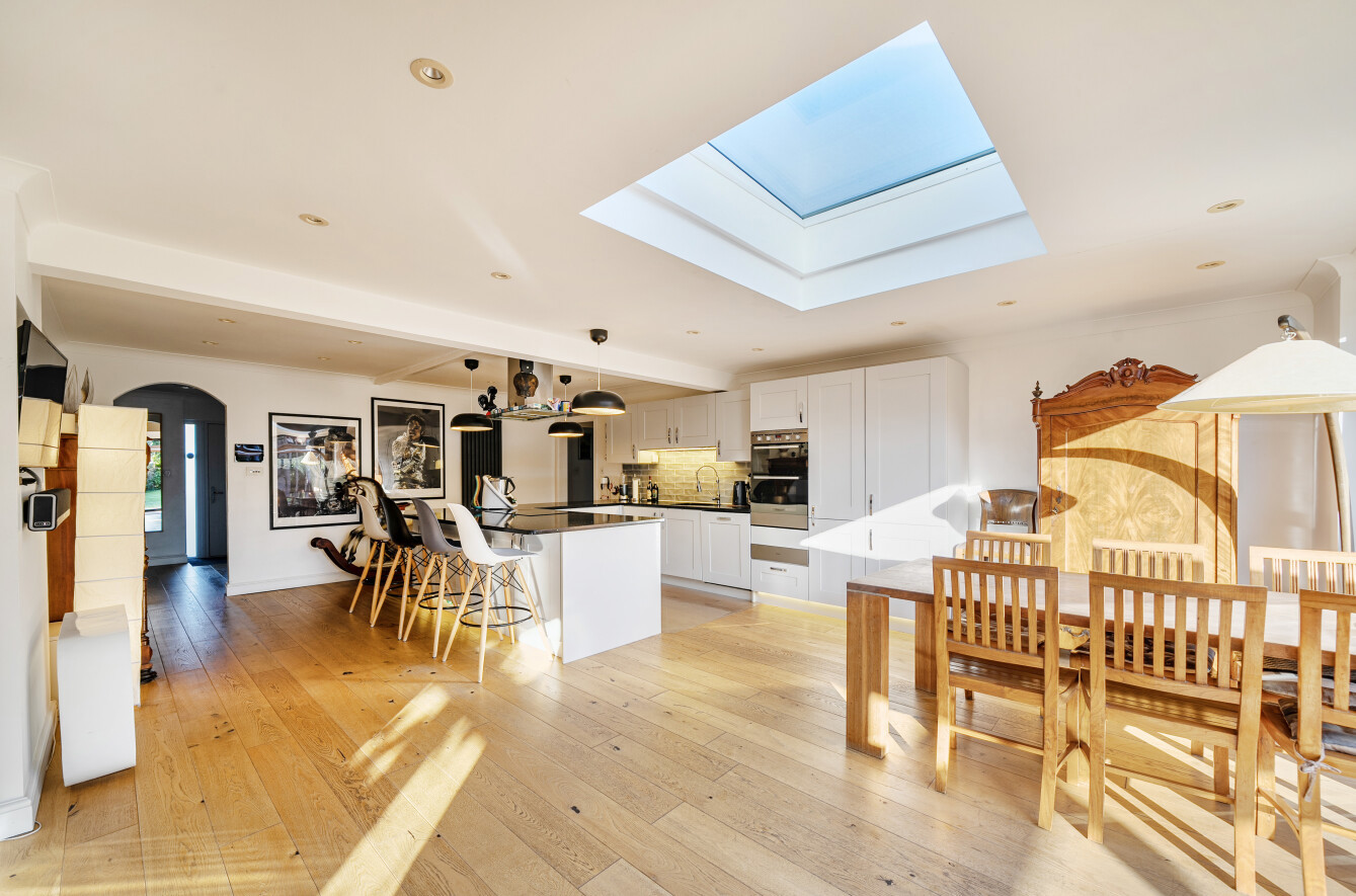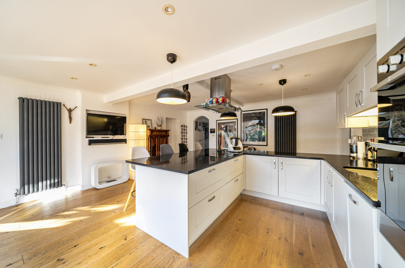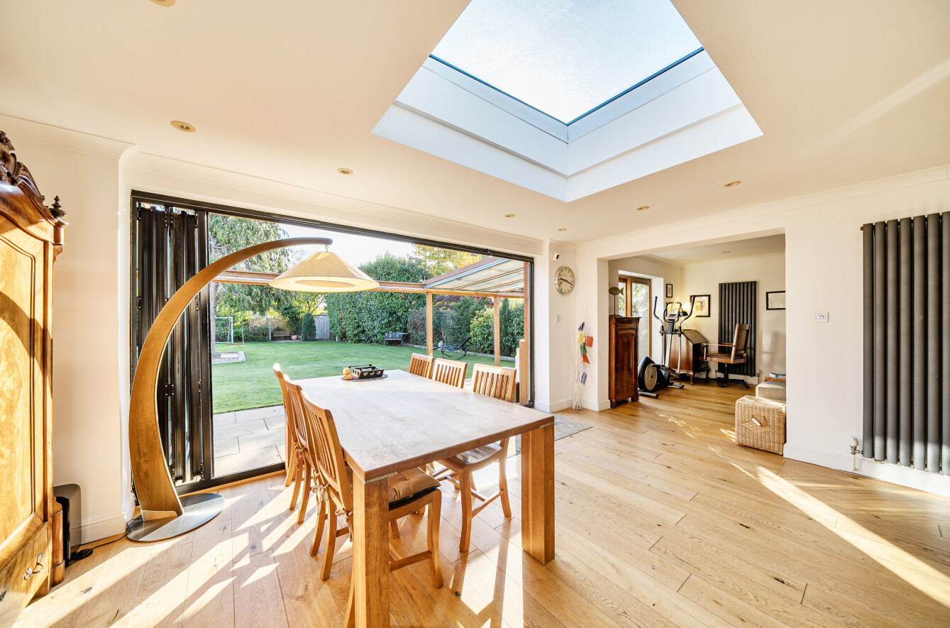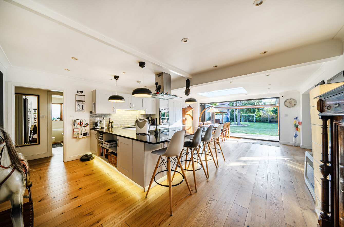 - High-Spec Open-Plan Kitchen/Family Room Featuring built-in appliances, breakfast bar, and bifold doors to the garden.
