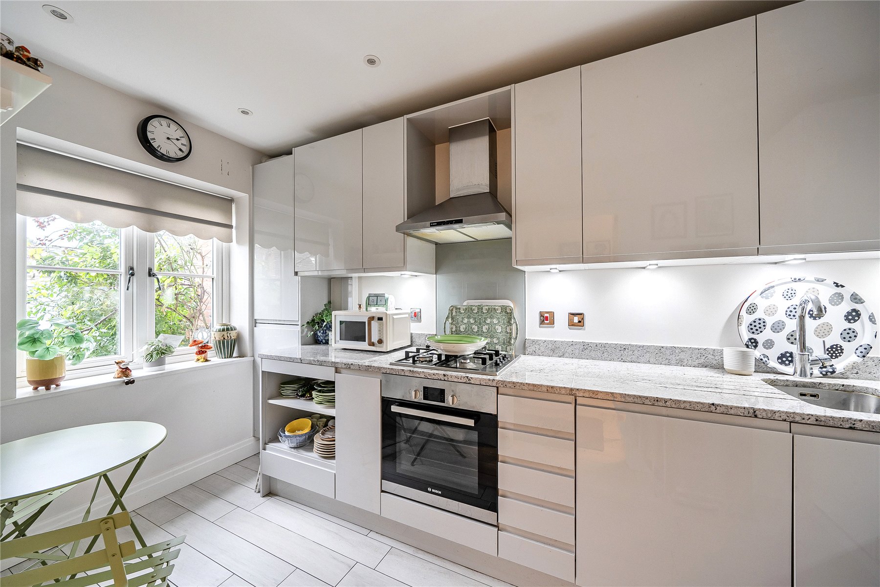 The front door opens into an entrance hallway with a convenient ground-floor WC and access to the kitchen, which enjoys an outlook to the front of the property. The bright, contemporary kitchen is fitted with a generous range of sleek high-gloss units complemented by quartz worktops. A good selection of integrated appliances is provided, along with space for a small breakfast table, making it both practical and sociable. To the rear, the sitting room is light and spacious, featuring a charming fireplace and a useful under-stairs storage cupboard. French doors lead out to the sunny, south-westerly facing garden, creating a wonderful flow between indoor and outdoor living. The garden is ideal for alfresco dining and container gardening, offering a peaceful and private space to relax.