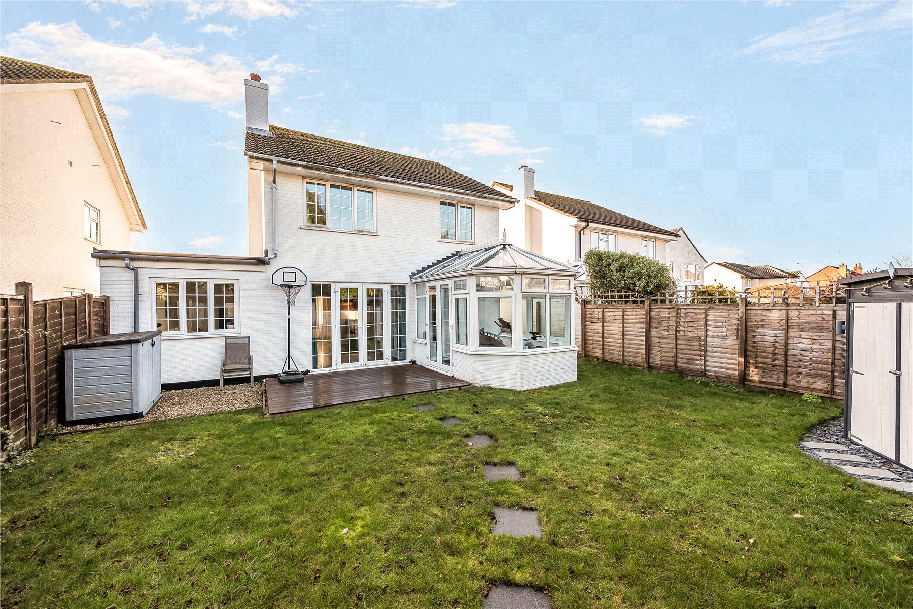 To the front of the property there is driveway parking for two vehicles, and access to the garage. The landscaped rear garden has been designed with entertaining in mind, offering multiple spaces for social gatherings. A composite decking areaaccessible from both the sitting room and the conservatorycreates the perfect setting for outdoor dining or relaxing. A separate seating area at the rear of the garden provides an excellent spot for barbecues and enjoying time with friends and family.