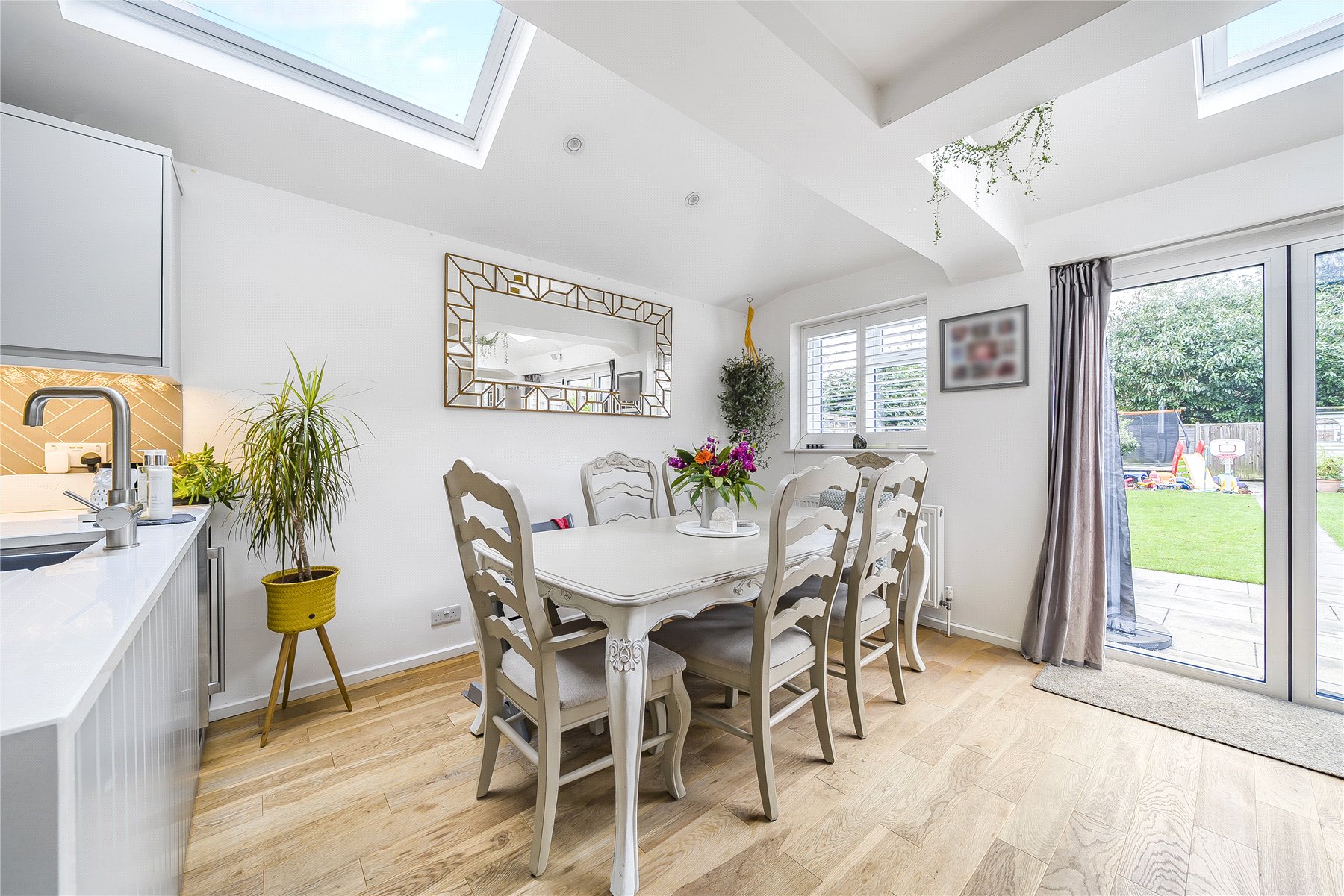 The real hub of this property is the open-plan living area that is well-suited to family life and is a perfect focal space where friends and family can gather, eat, and chat. The Paul Rosa kitchen is fitted with a generous range of units with Silestone worktops. Integrated appliances include a boiling water tap, a wine cooler, dishwasher, gas hob and an oven. This bright and airing room has Bi-fold doors that open directly onto the patio and there is plenty of space for a family dining table and chairs alongside a lounge suite.