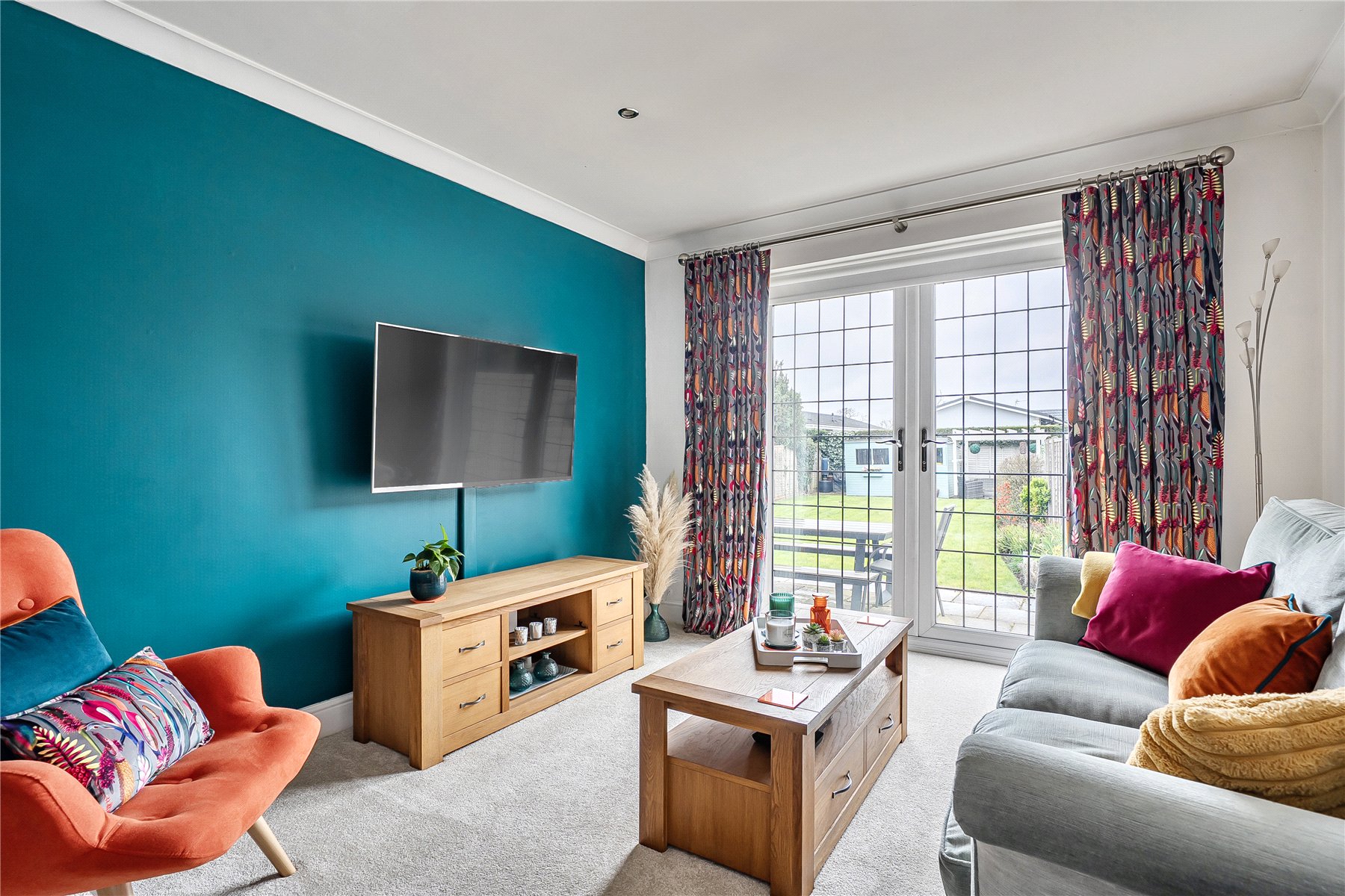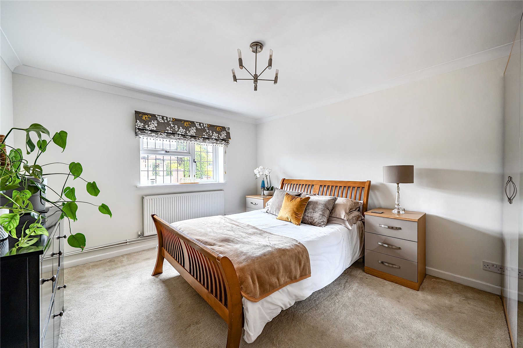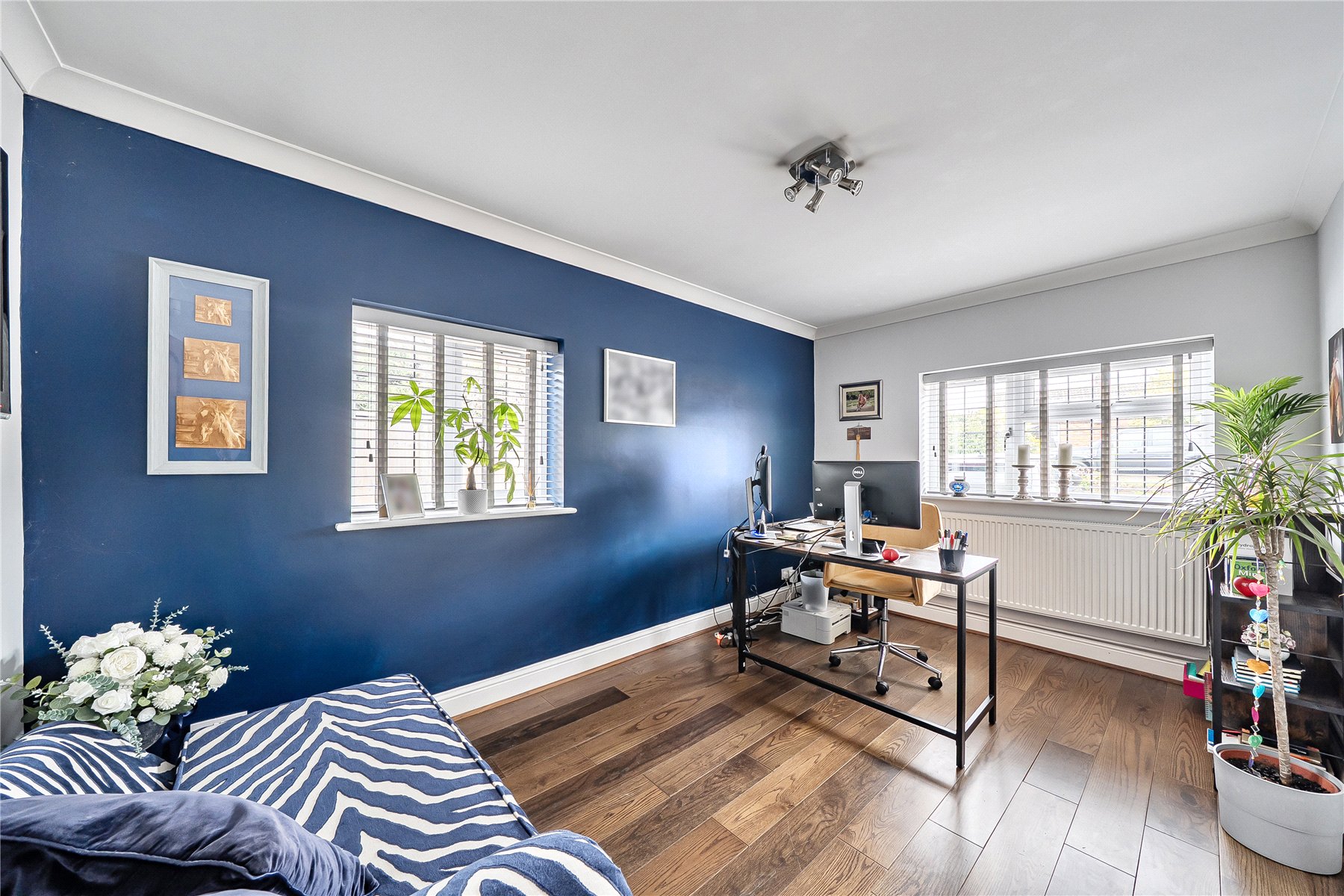 Upon entering, the property immediately impresses with its light-filled and flexible living spaces. One of the reception rooms, overlooking the driveway is currently used as a study and enjoys double-aspect windows. A generously sized double bedroom, also positioned at the front, benefits from built-in storage and similar bright, airy proportions. Across the hallway, the spacious sitting room features a dual-aspect design, allowing natural light to flood the space. French doors open directly onto the rear patio.