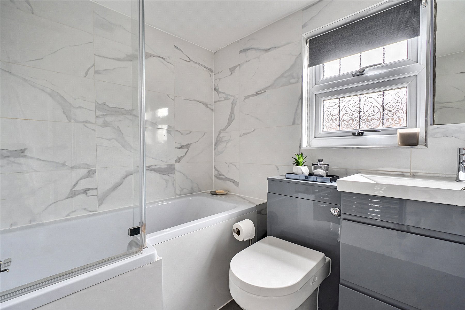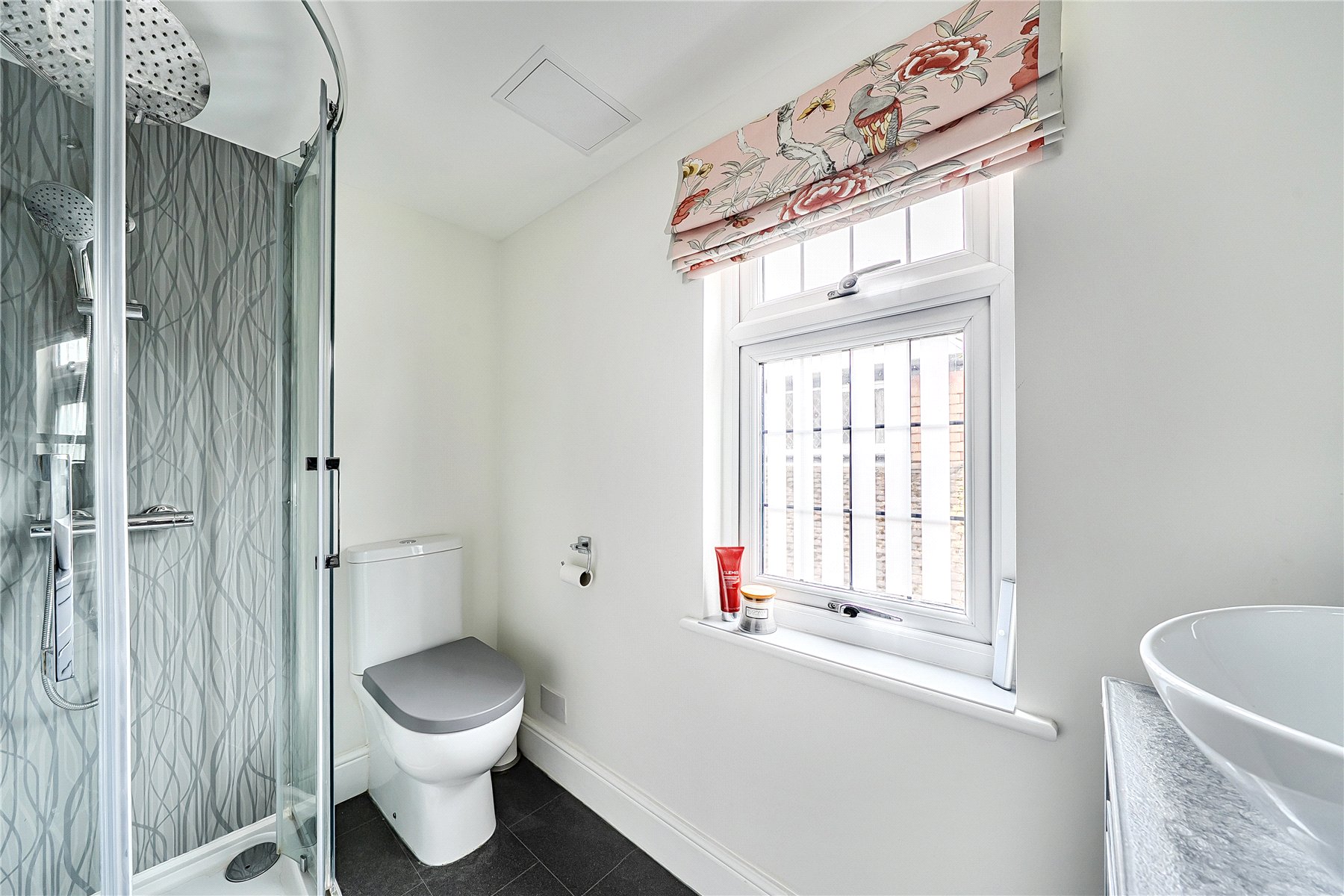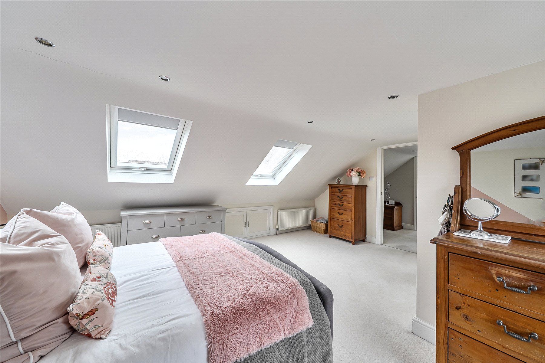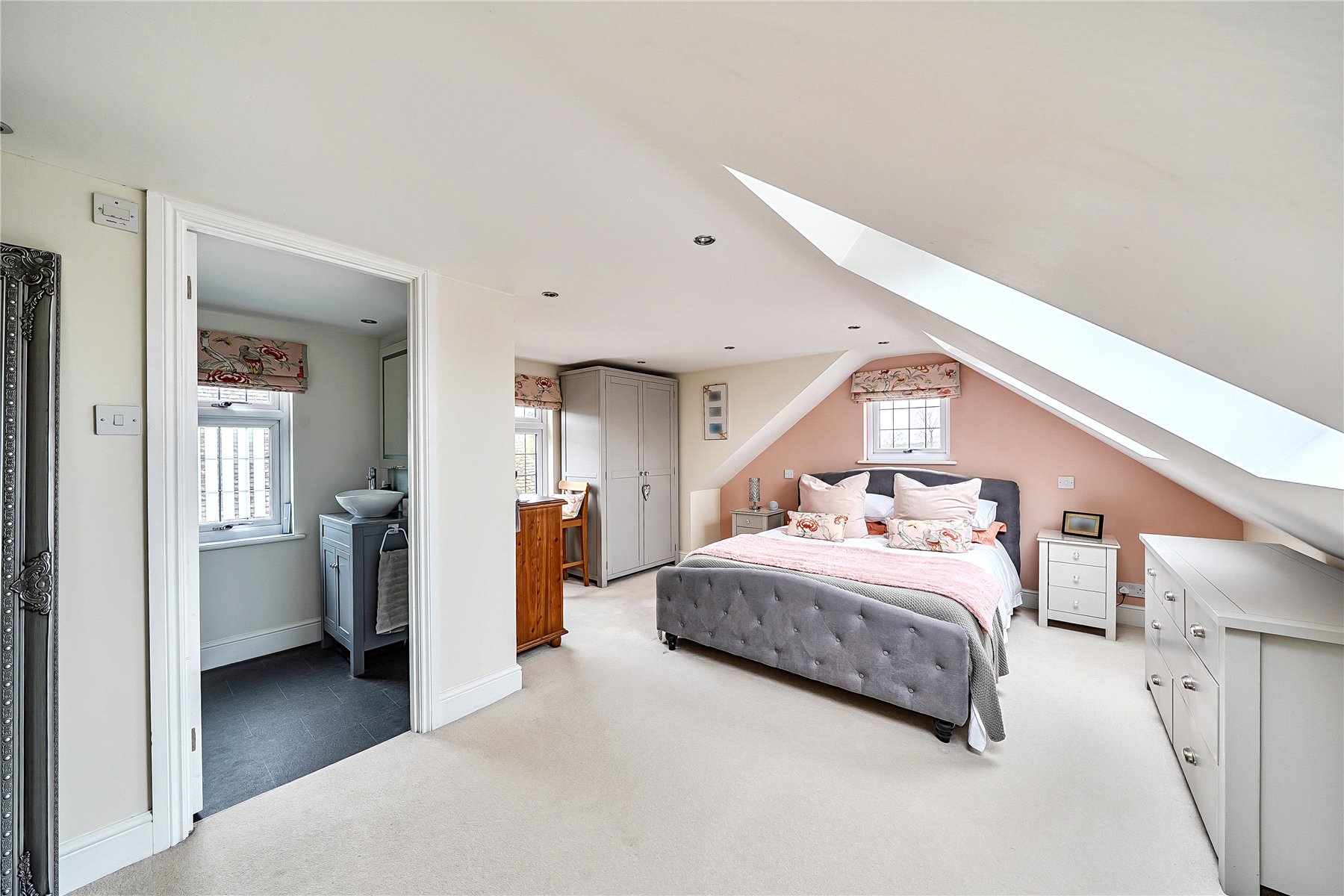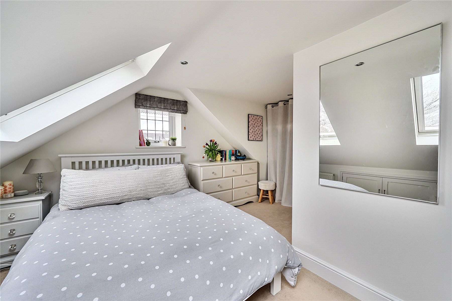 Upstairs, there is a contemporary, fully tiled bathroom and two well-proportioned double bedrooms. The standout master suite includes an ensuite shower room, while both bedrooms benefit from skylight windows along with access to the eaves for additional storage.