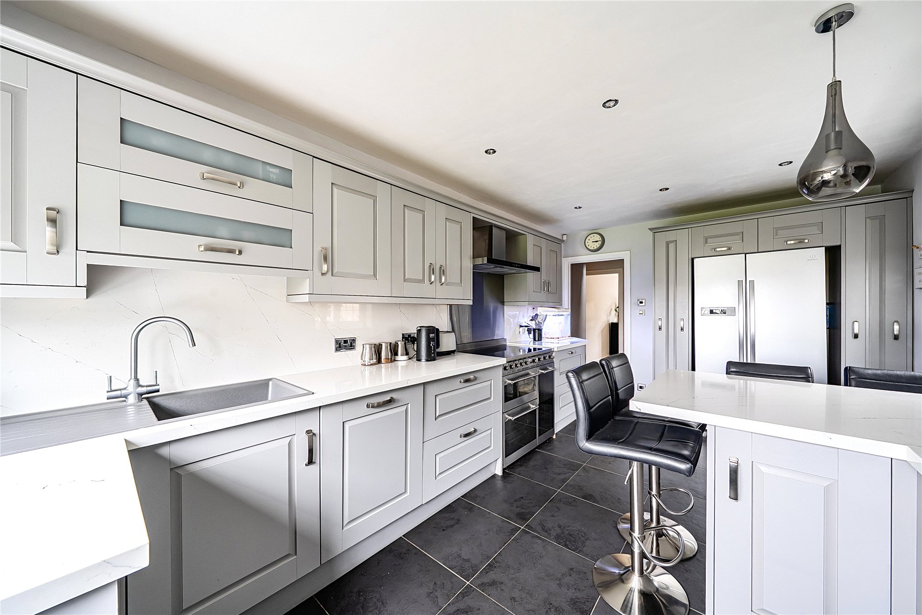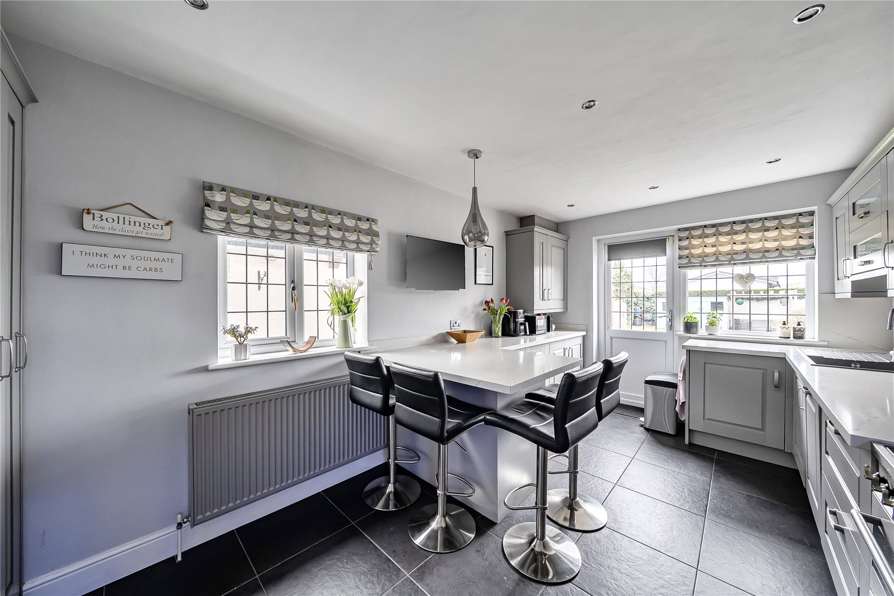 The kitchen is both stylish and practical, fitted with a comprehensive range of units and complemented by sleek worktops. A peninsula breakfast bar provides a sociable focal point, while a door offers convenient access to the rear garden.
