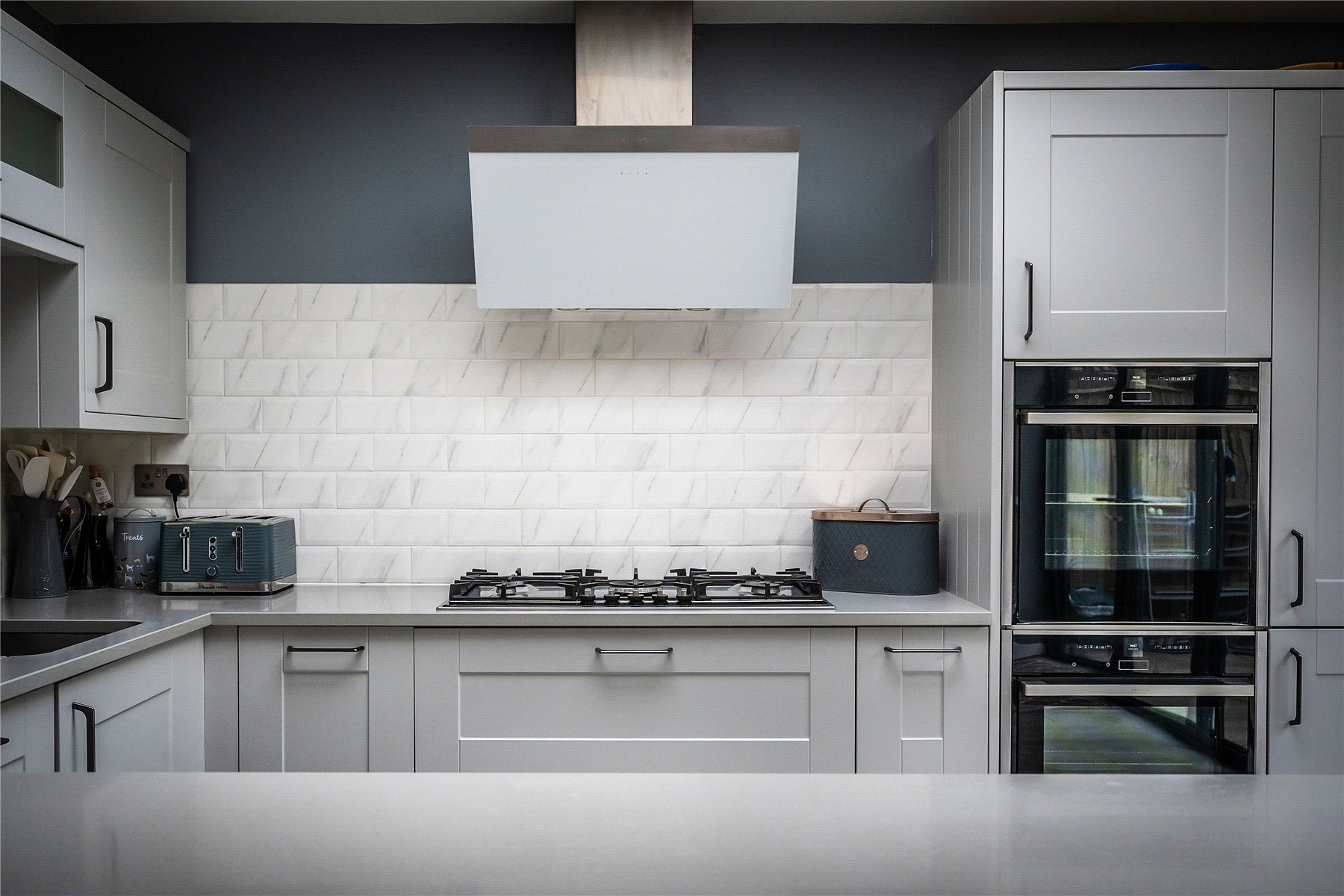 The kitchen is a standout feature, boasting a generous range of shaker-style units with quartz worktops, a breakfast bar, and integrated appliances. Skylights and bi-folding doors fill the space with natural light and open onto the patio, creating a seamless indoor-outdoor flow.