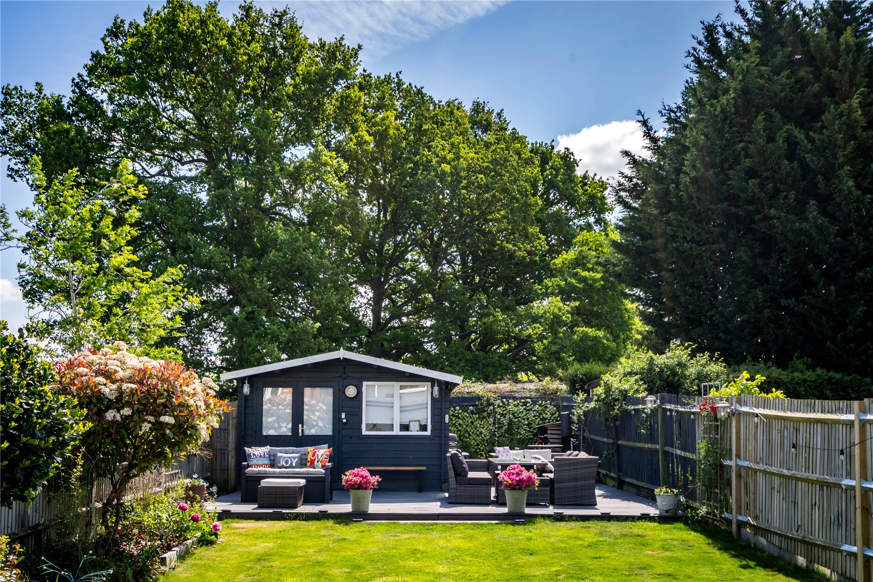 The large rear garden has been immaculately maintained, with a level lawn bordered by mature planting and a further sitting area at the far end. A charming wooden summer house with power offers additional versatile space ideal for a home office, studio, or relaxation area. At the front, there is driveway parking for several vehicles and a further lawned area.The property is situated on Portsmouth Road, just a short walk from the famous village green and local shops, many pubs and amenities. The A3 and M25 are just a few minutes drive away.