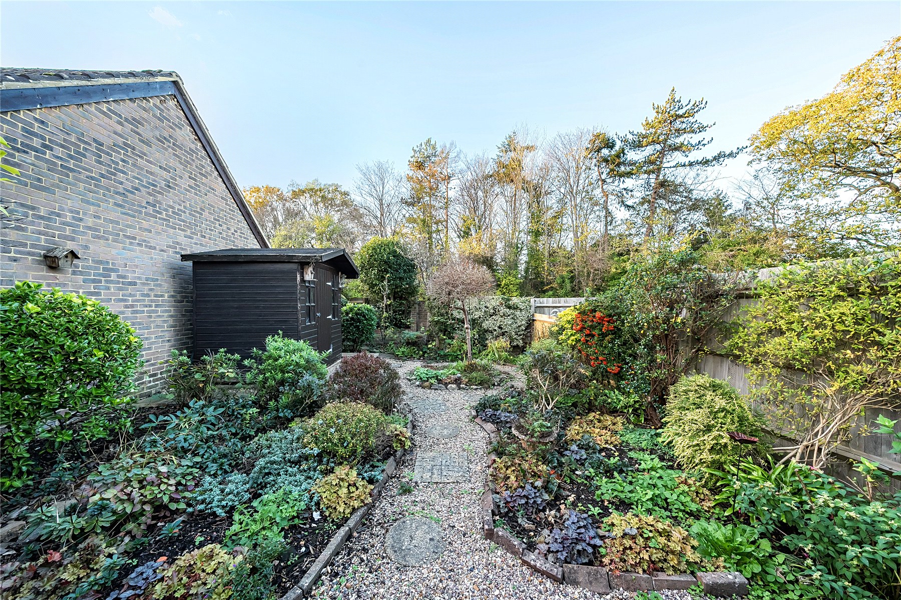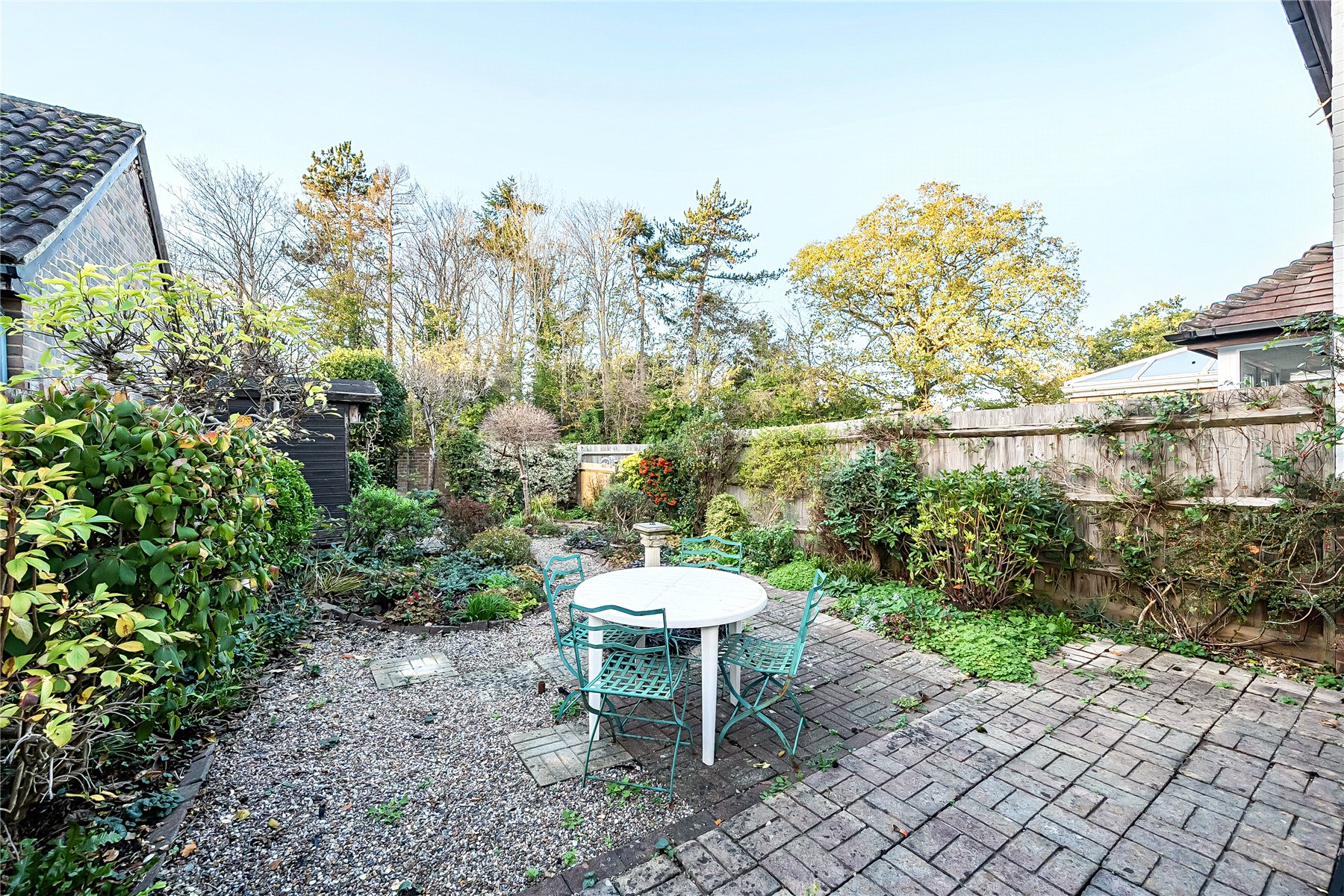 Outside, to the front, there is a detached garage with power and an electric roller door and driveway parking. A side gate gives access to the rear garden, which has been thoughtfully landscaped to provide year-round interest with established greenery and carefully curated planting. There is a pleasant paved seating areaperfect for outdoor diningand a gravel pathway leading to a wooden outbuilding at the far end of the garden.