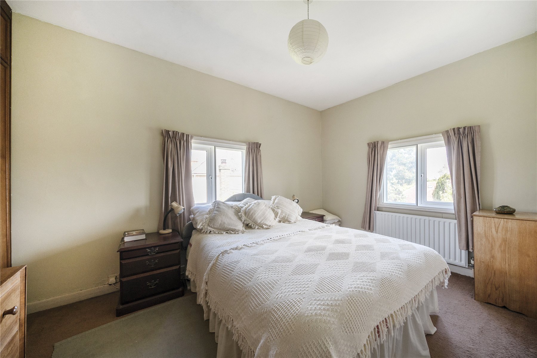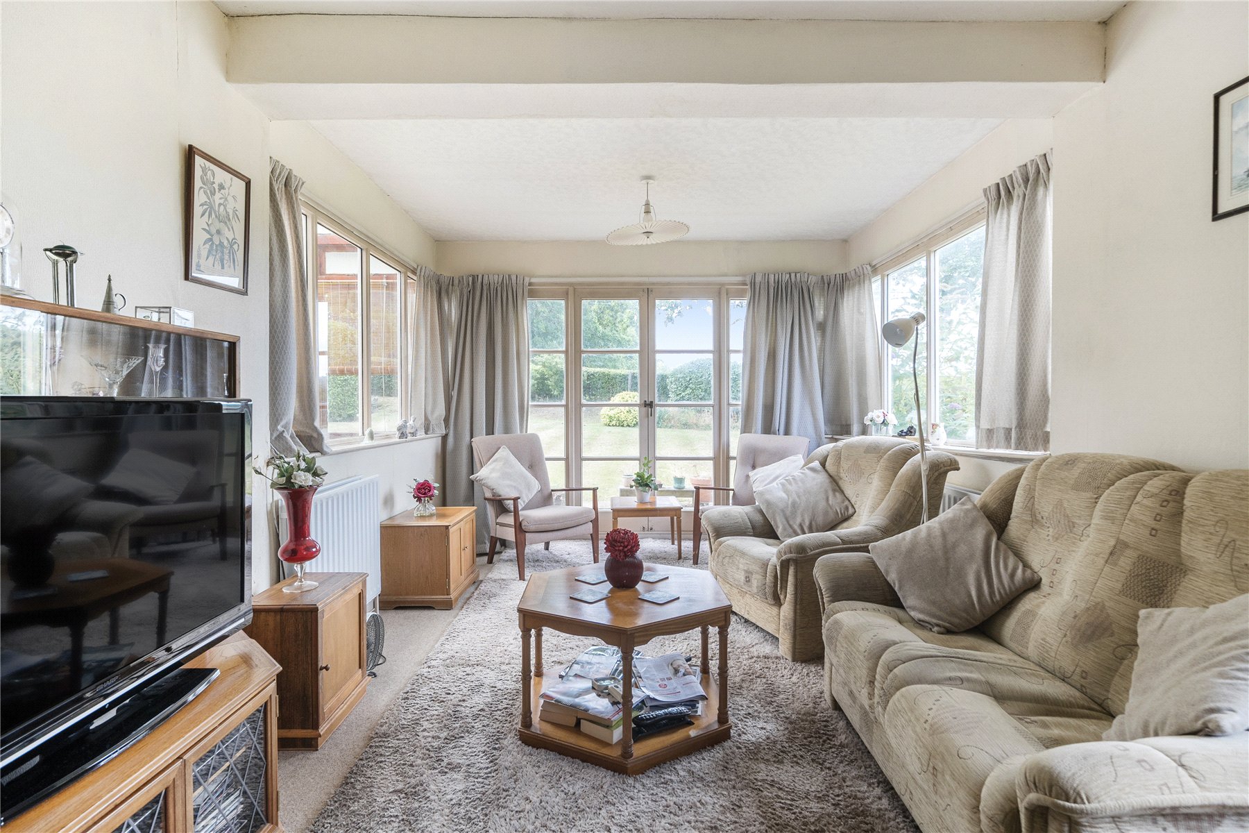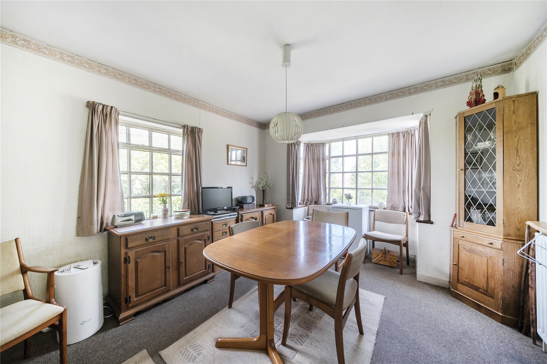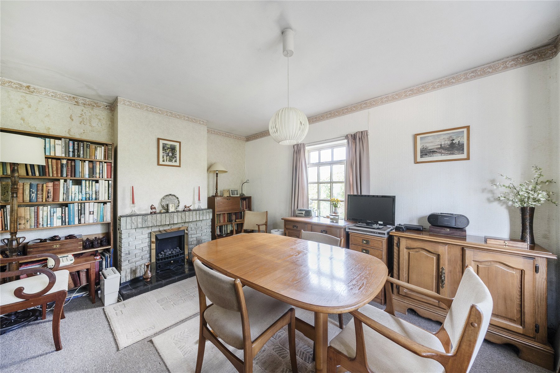 A long gravel driveway leads up to the detached garage, with a path to the side and steps up to the front door. The double-aspect dining room is situated at the front of the property, with a large bay that overlooks the front garden. Further along the hallway, the sitting room features a coal-effect gas fireplace and boasts triple-aspect views of the rear garden and beyond.