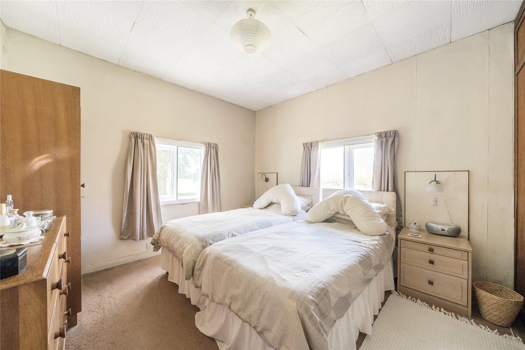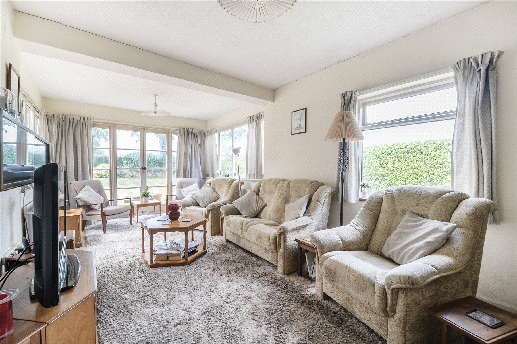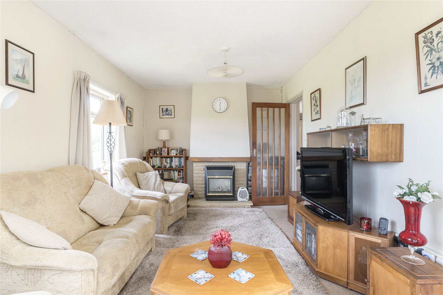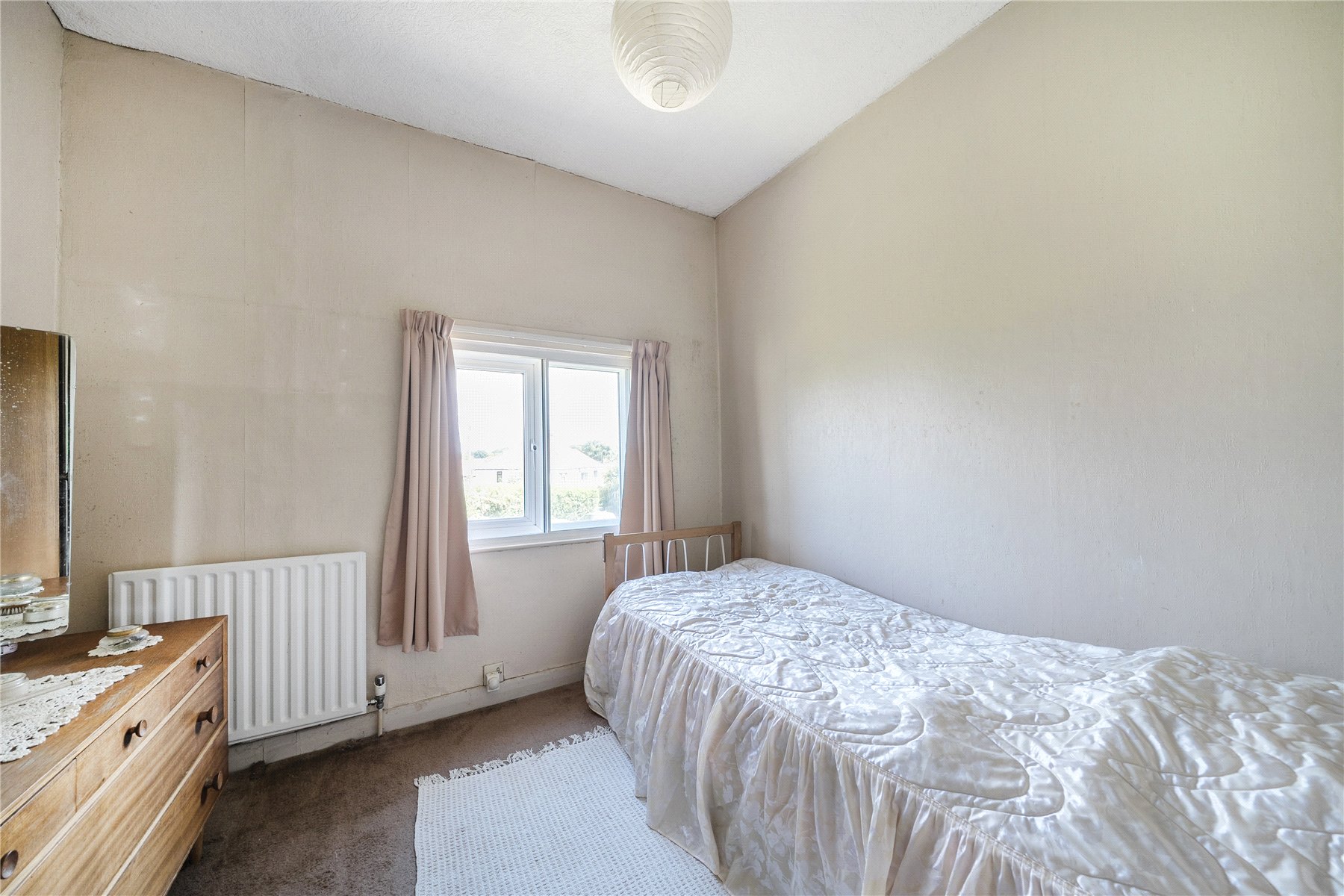 A long gravel driveway leads up to the detached garage, with a path to the side and steps up to the front door. The double-aspect dining room is situated at the front of the property, with a large bay that overlooks the front garden. Further along the hallway, the sitting room features a coal-effect gas fireplace and boasts triple-aspect views of the rear garden and beyond.
