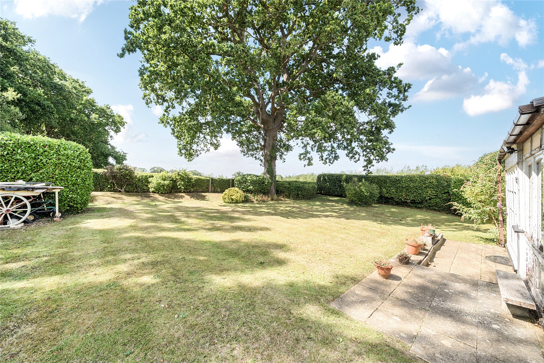 Outside, the front of the property is surrounded by mature hedging, with a driveway and a lawn where two large fruit trees are planted. The garden wraps neatly around the property and is surrounded by mature hedging. A small patio area extends around the side of the property, where two outbuildings are located together with rear access to the detached garage - which is in need of repair in order to return it to use as a garage .