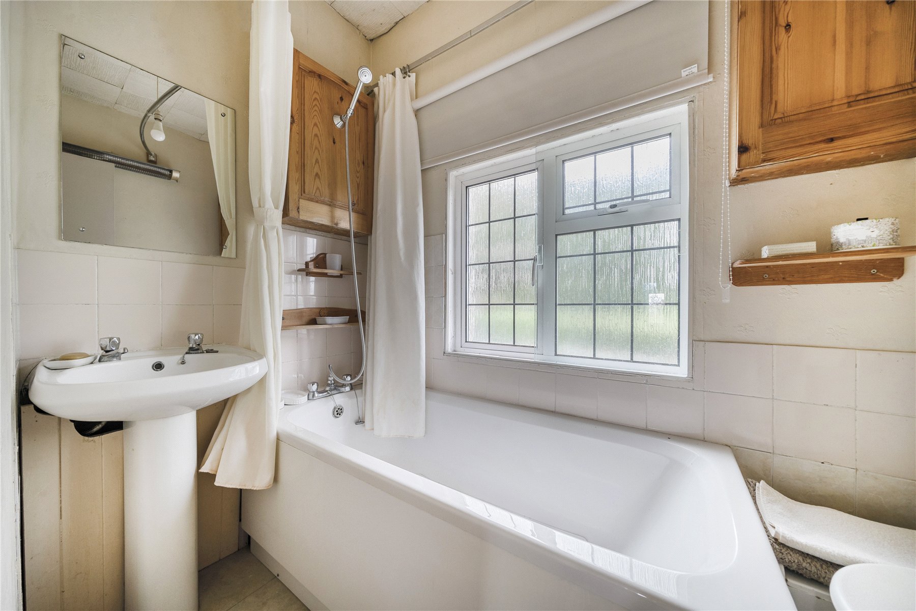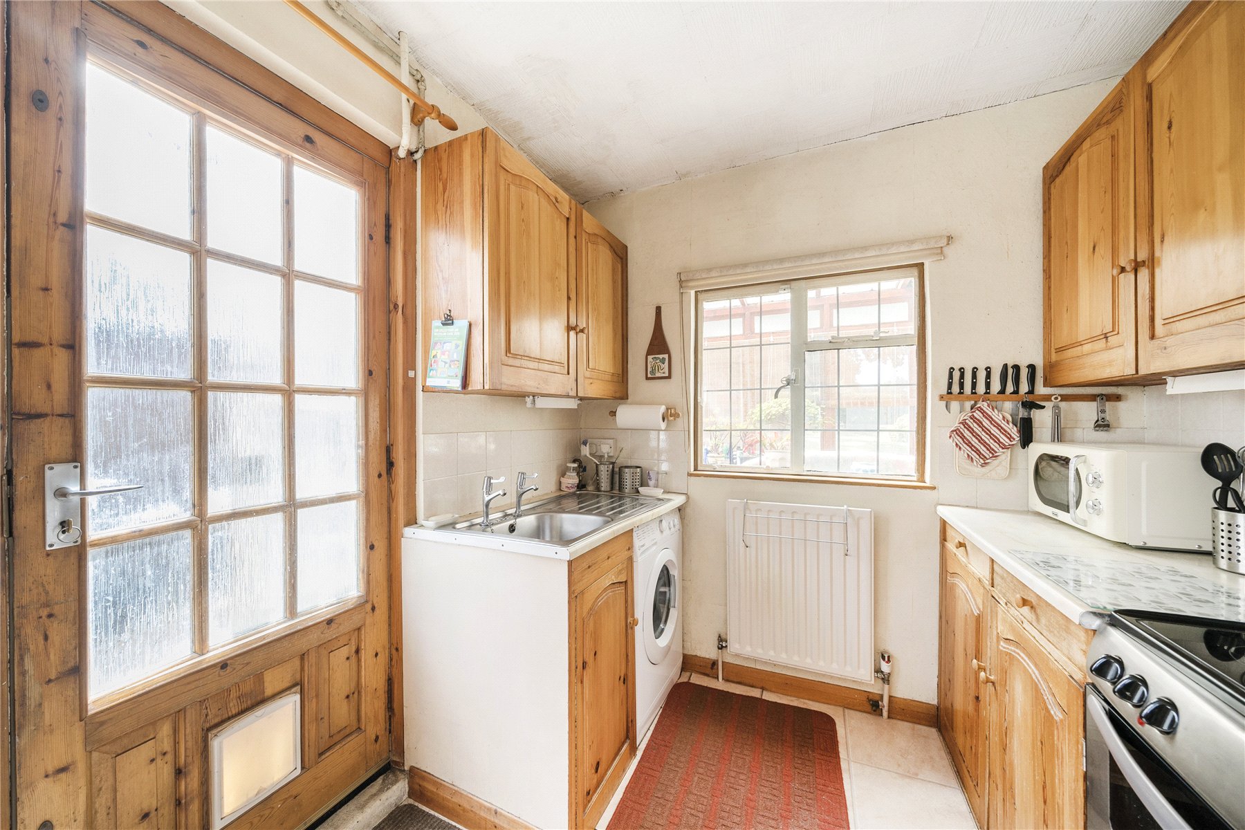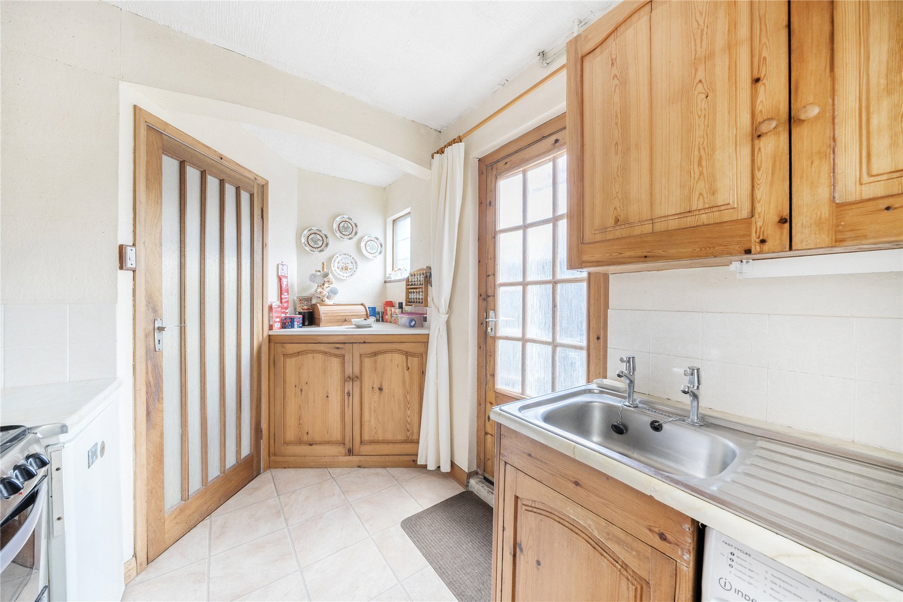 The kitchen is fitted with a selection of base and eye-level units with space for large domestic appliances under the worktops. A window looks into the lean-to at the rear, which can be accessed via a separate door in the garden.