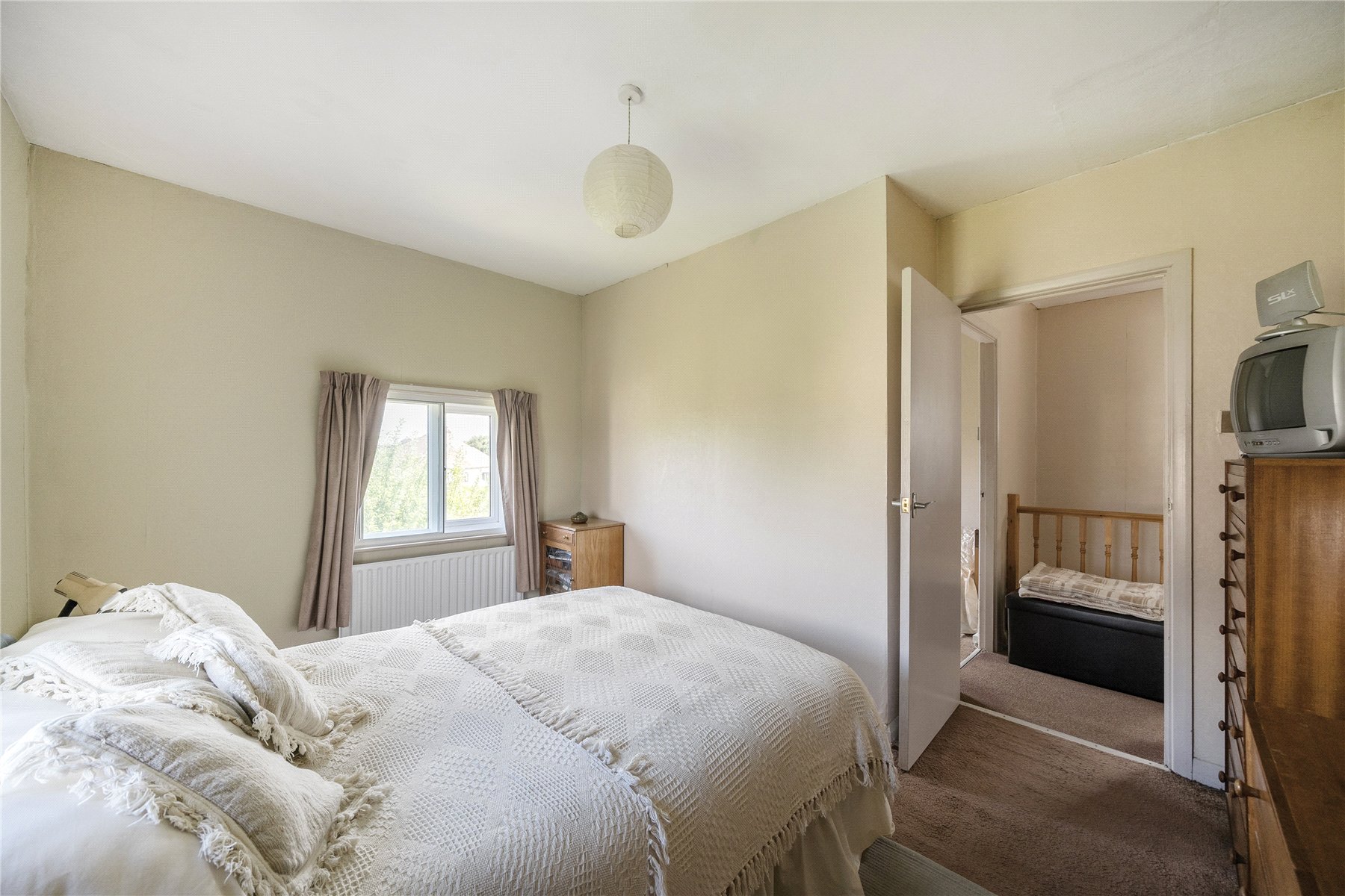 On the first floor, there are three bedrooms; the two larger bedrooms enjoy double-aspect views and have built-in storage. The bathroom is fitted with a modern white suite with a separate WC layout.
