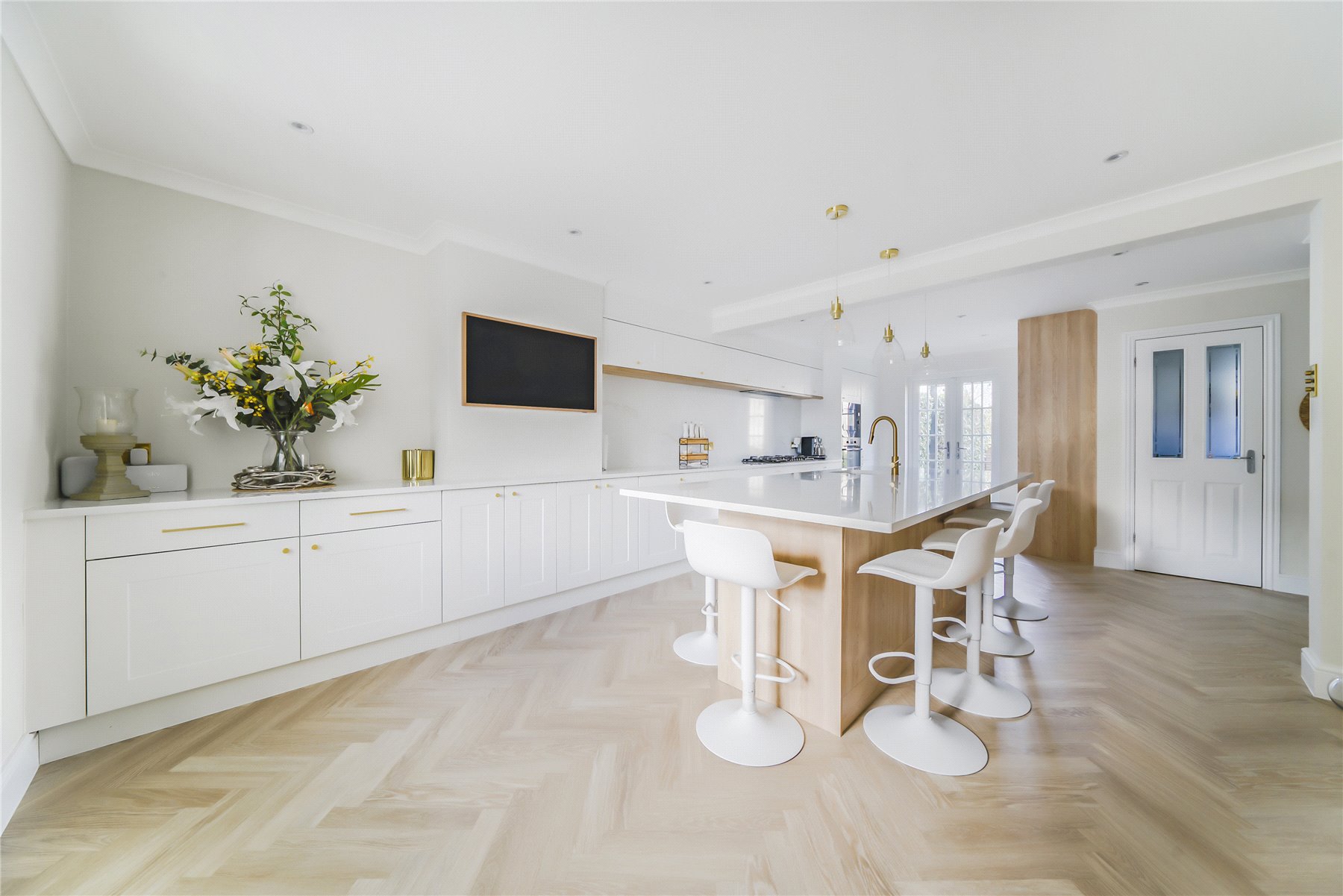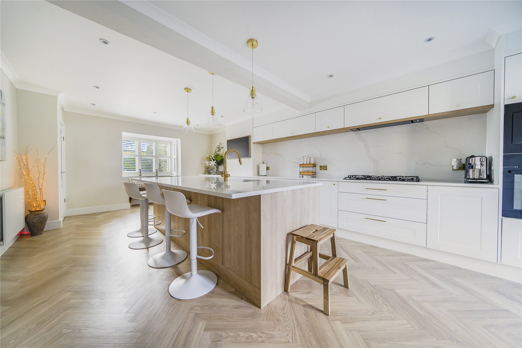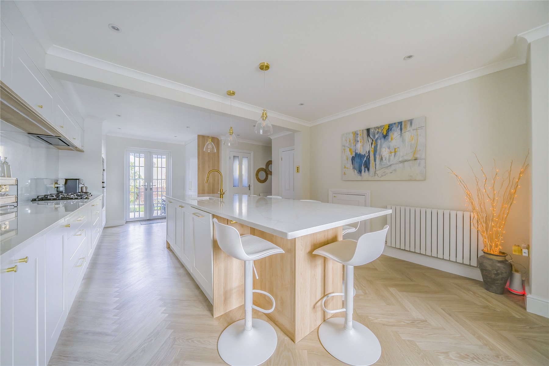 At the heart of the home is a stunning double-aspect kitchen/breakfast room, fitted with an extensive range of modern units and centered around an impressive extra-large islandperfect for entertaining or family gatherings. French doors open directly onto the rear patio, creating a seamless indoor-outdoor flow, while a separate utility room provides additional practicality.