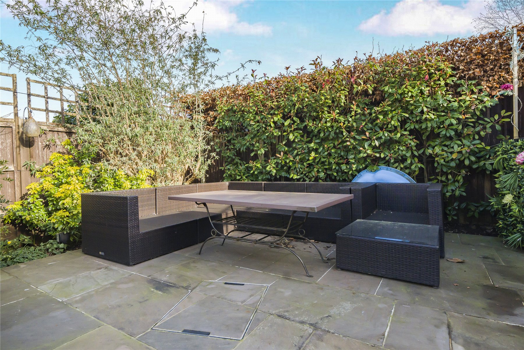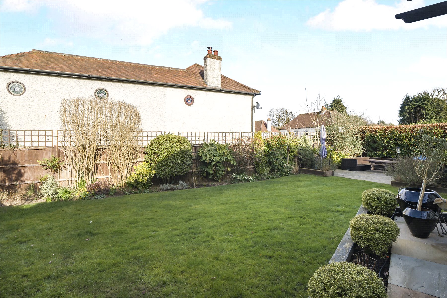 Externally, the property continues to impress. To the front, a large gravel driveway provides ample parking. The rear garden is beautifully arranged with multiple seating areas, a well-kept lawn, and mature flower beds and shrub borders to create an attractive and private outdoor space.
