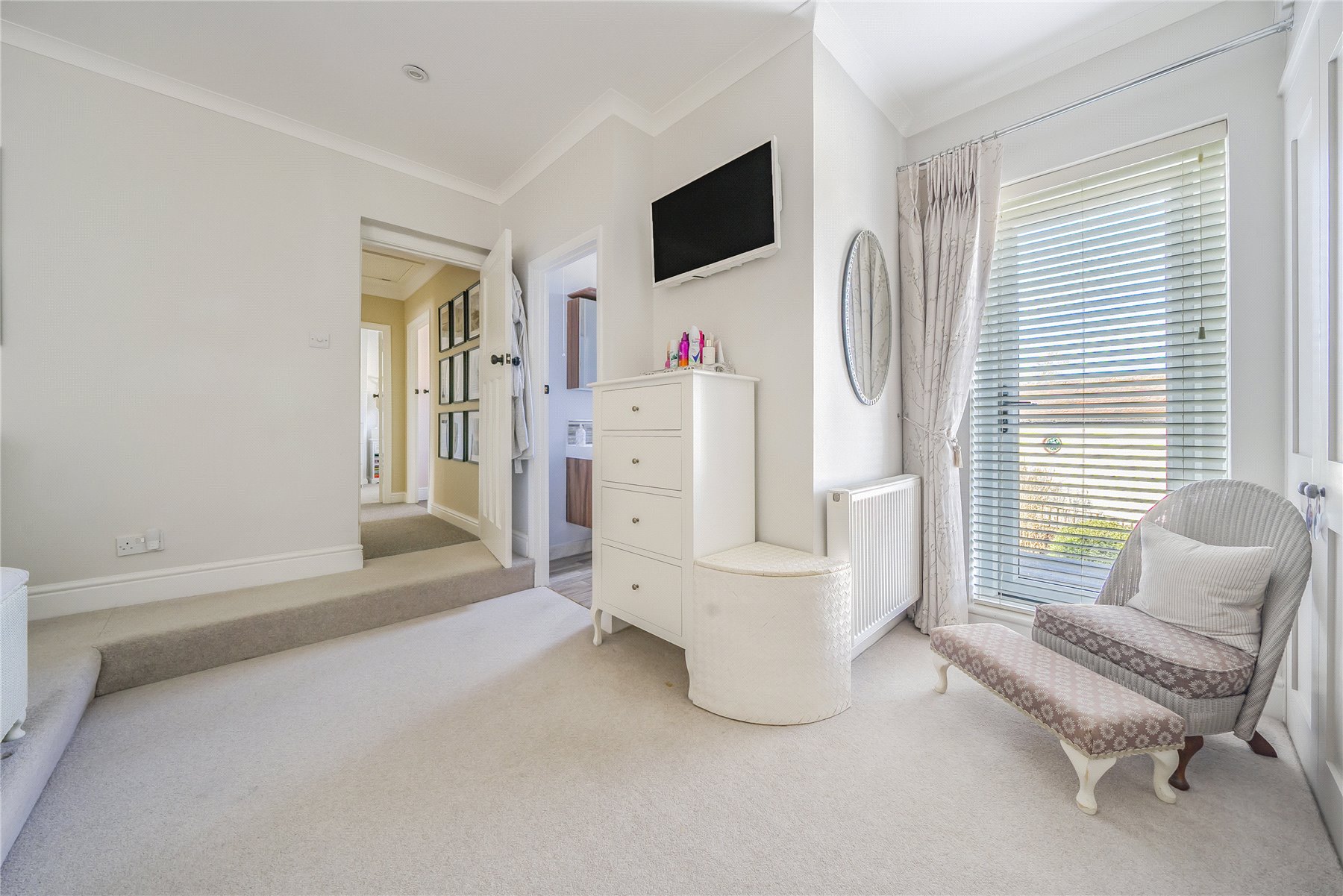 Stepping down from the kitchen, the bright and airy dining room offers an elegant space for more formal occasions. Stylish wall paneling adds character, and a conveniently placed WC is discreetly positioned to one side. From here, a further door provides access into the garage and out to the garden beyond. The inviting sitting room is located at the front of the house and features bespoke carpentry along with shuttered French doors that open onto a secluded patio areaan ideal spot for morning coffee or evening relaxation.