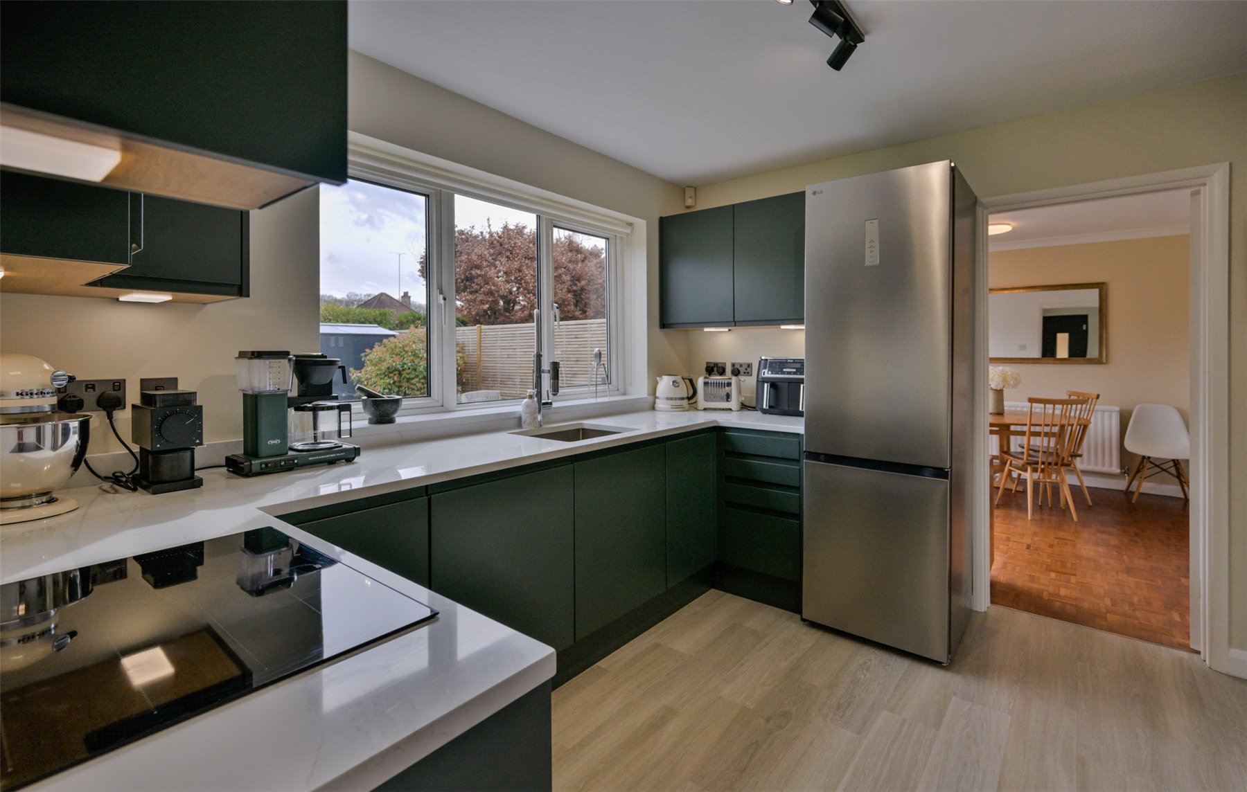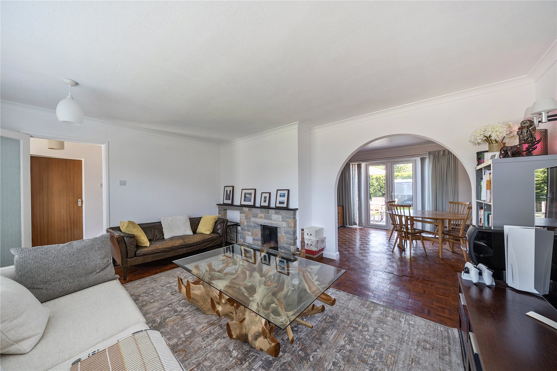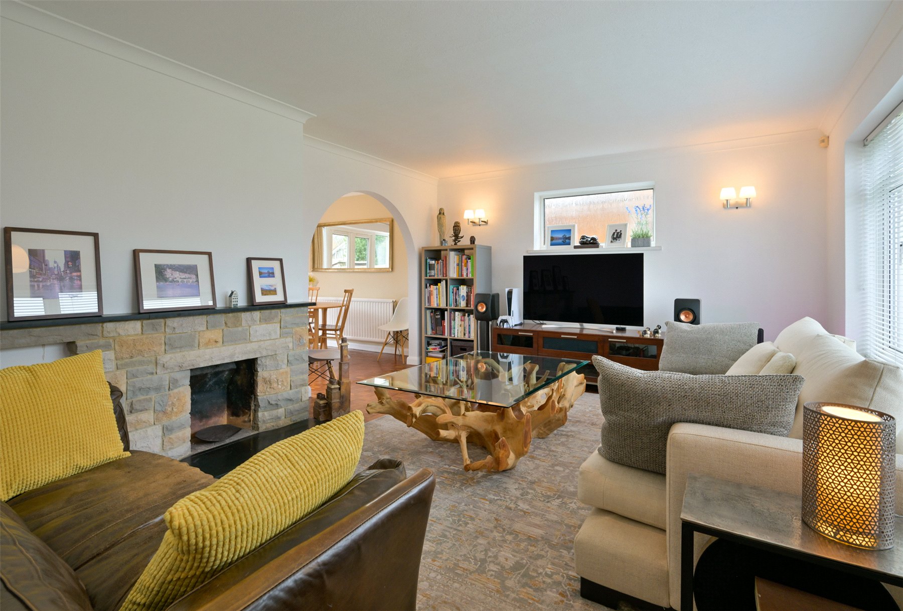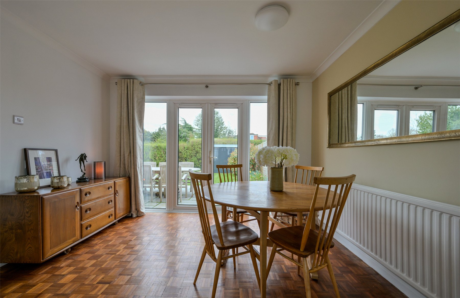 Upon entering, the welcoming entrance hall features a convenient WC, while stunning parquet flooring flows seamlessly through to the principal reception rooms. The sitting room enjoys a large picture window that floods the space with natural light and offers a pleasant outlook over the front garden. An open fireplace provides a cosy focal point, creating a perfect setting for relaxing evenings.
