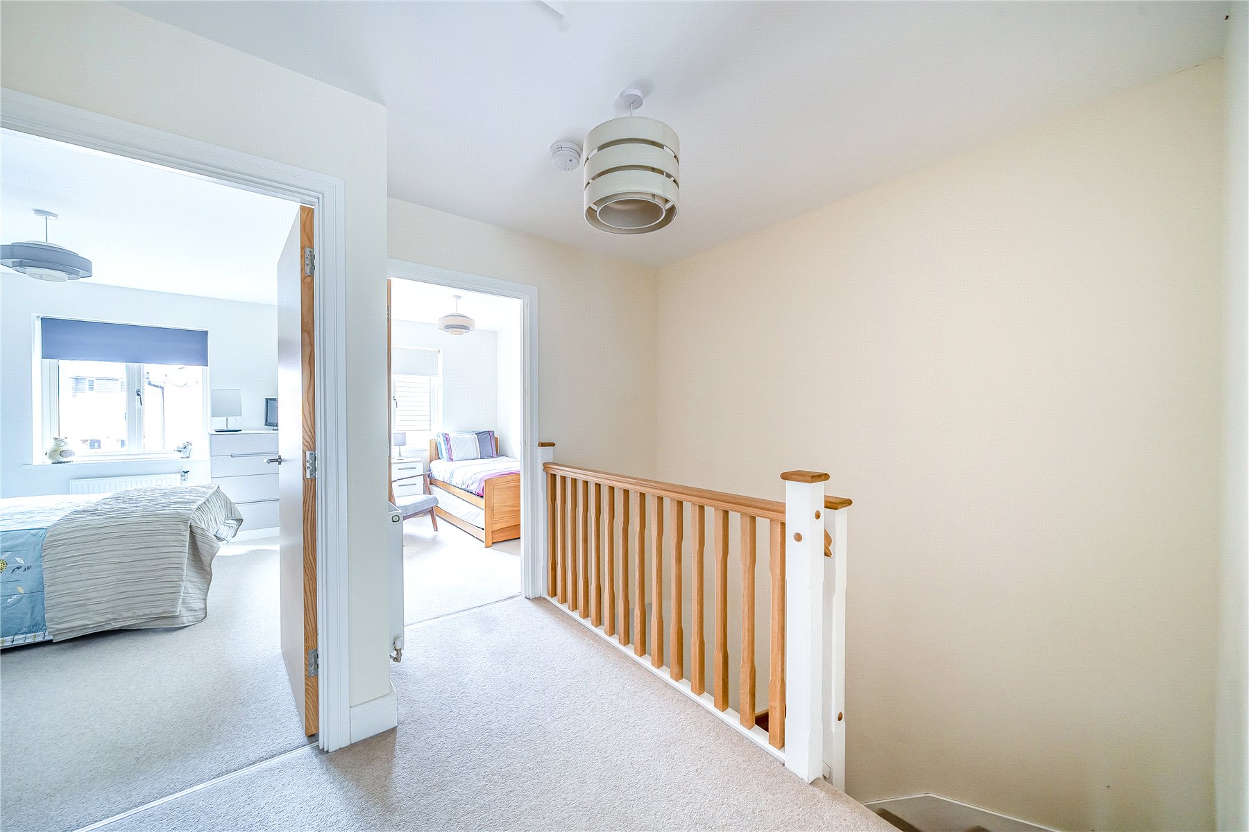 On the first floor, there are three bedrooms and a family bathroom, which is fitted with a modern white suite. The master bedroom boasts French doors that open to a private balcony. There is also a dressing area with built-in storage and an en-suite shower room.