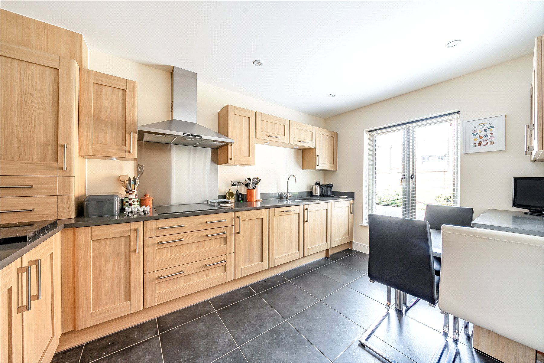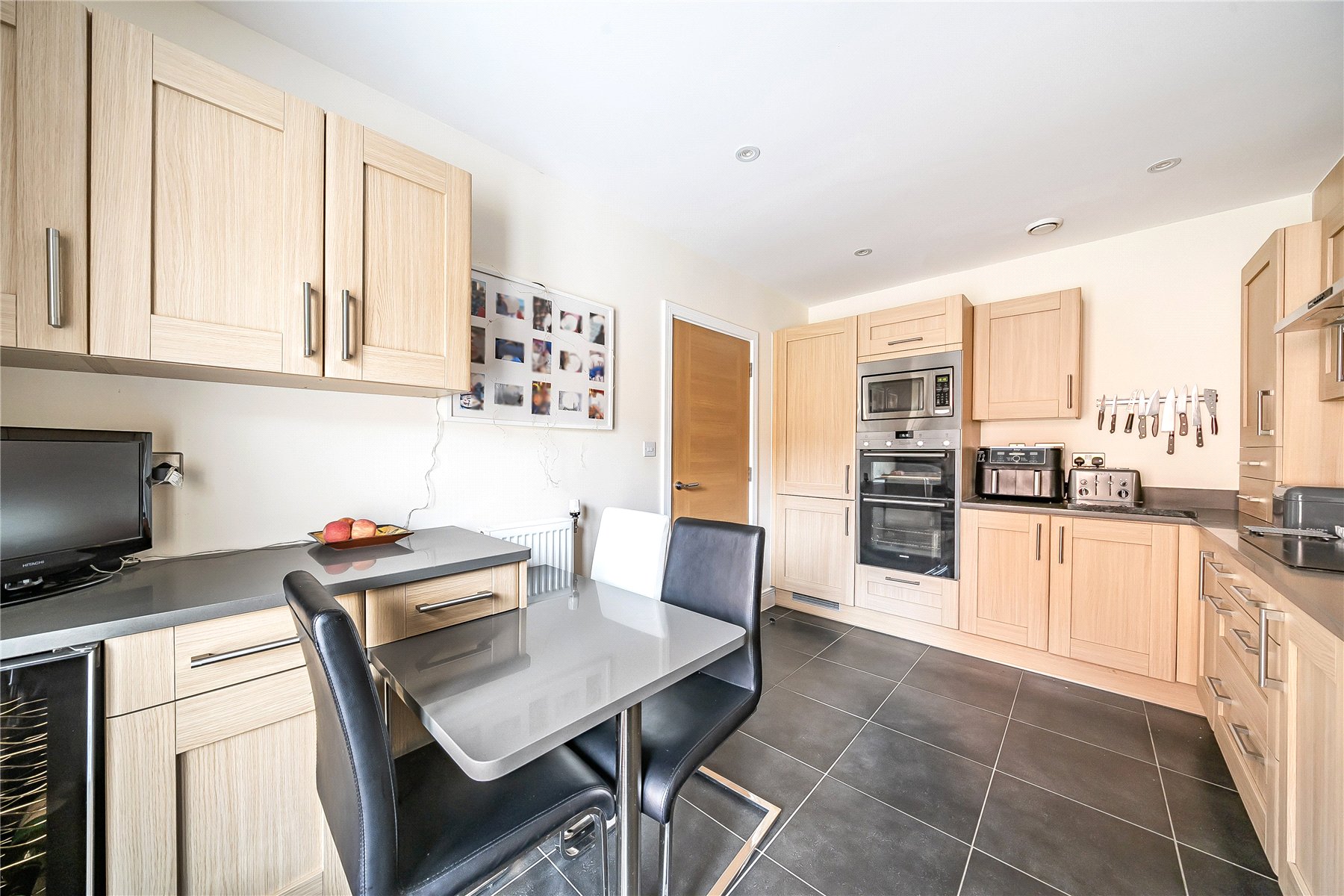 The front door opens into a good-sized entrance hall with a larger-than-average cloakroom and access to under-stair storage. The light and airy kitchen features double-opening windows to the front and is fitted with a generous range of shaker-style units, quartz worktops, and a deftly positioned matching breakfast table. Integrated appliances include a double oven, an induction hob, and a washer/dryer, amongst others.