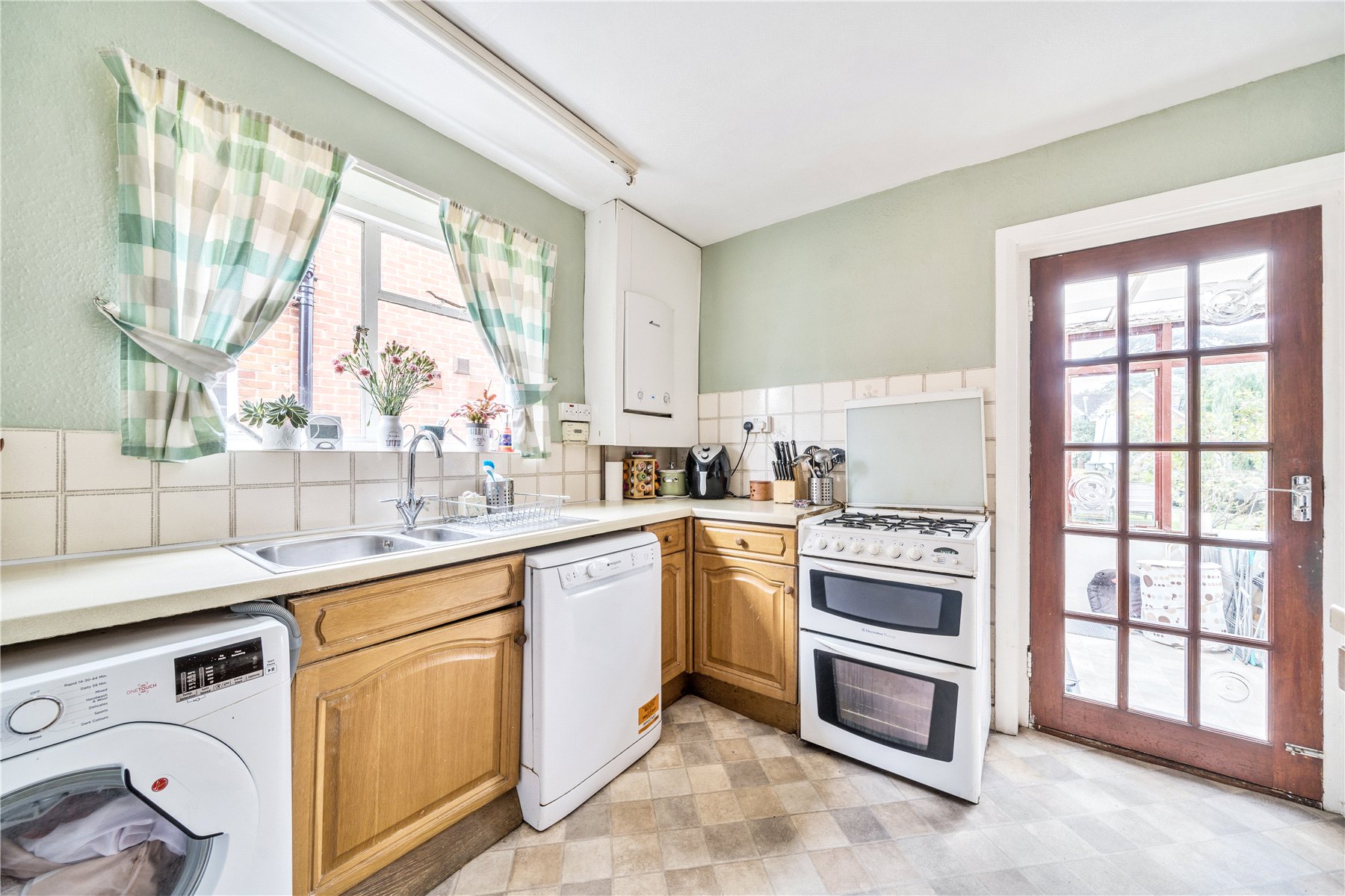 The kitchen is fitted with a range of units, with space under the worktops for large domestic appliances. A glazed door gives access to the lean-to at the rear of the property with a further door leading directly out to the garden.