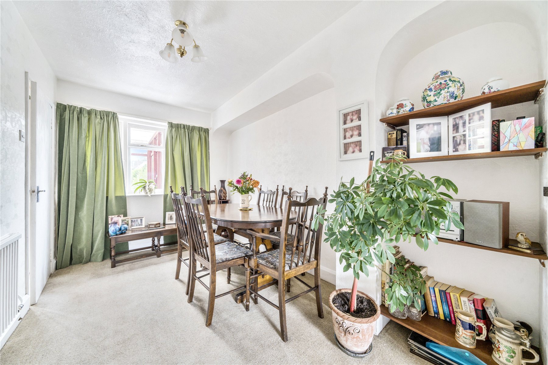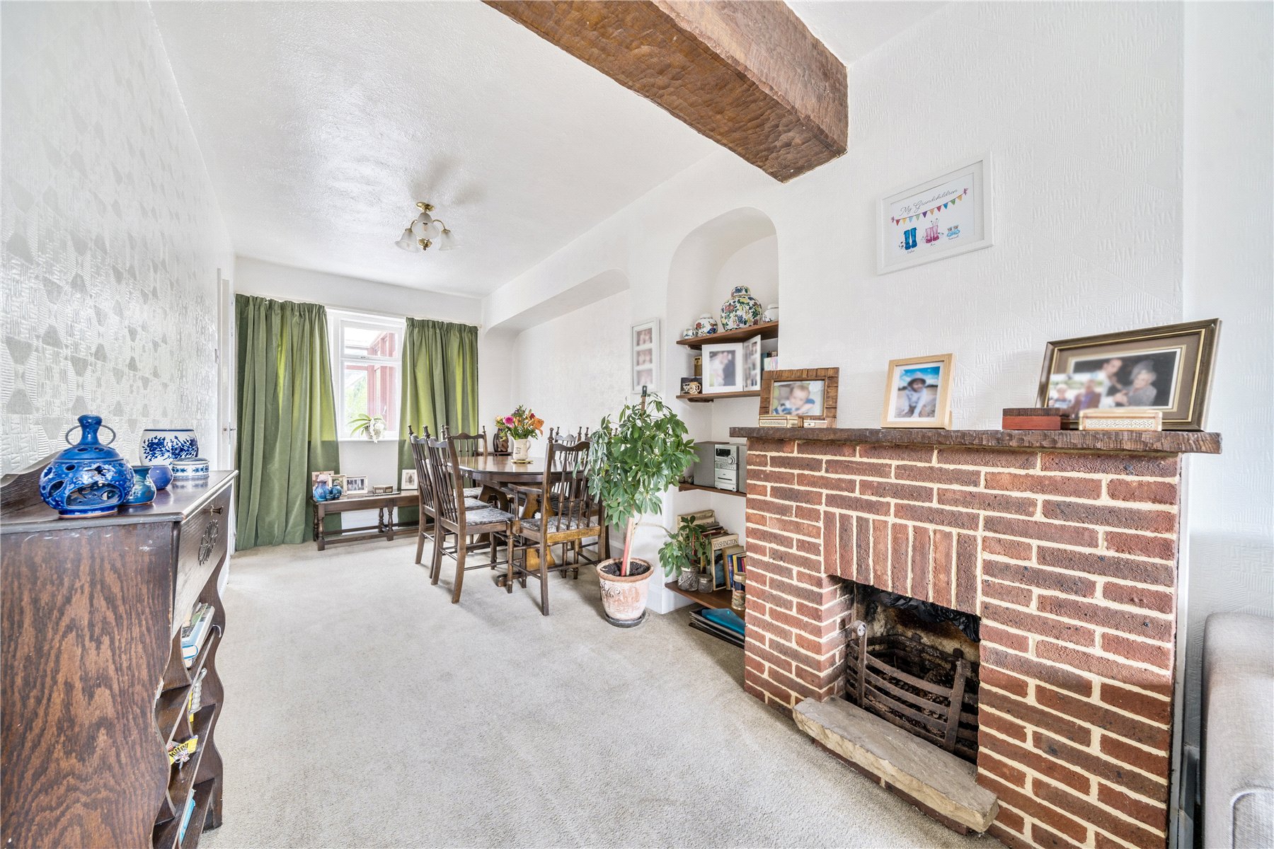 The front door of this property opens into a small entrance hall with stairs to the first floor and a door through to the spacious reception room. A large picture window in a bay overlooks the front garden and fills the room with natural daylight. An open fire place and an exposed ceiling beam, are real stand-out features that flow into the light and airy dining area at the rear, boasting views over the lengthy garden beyond.