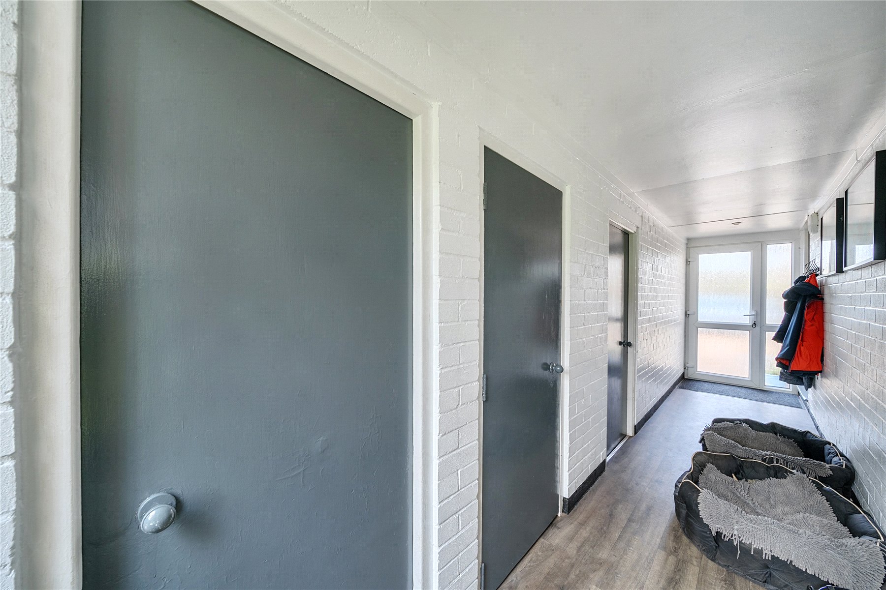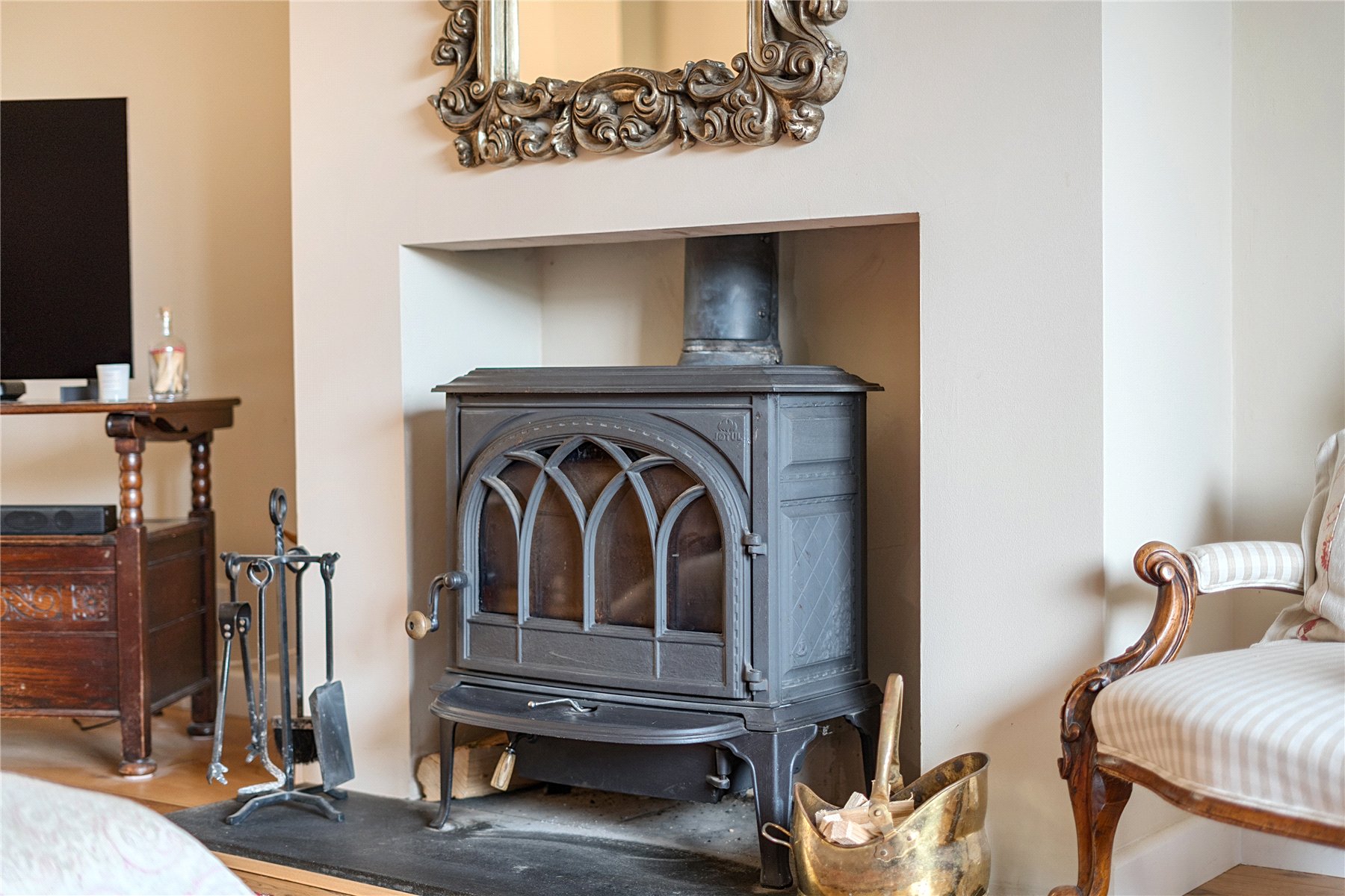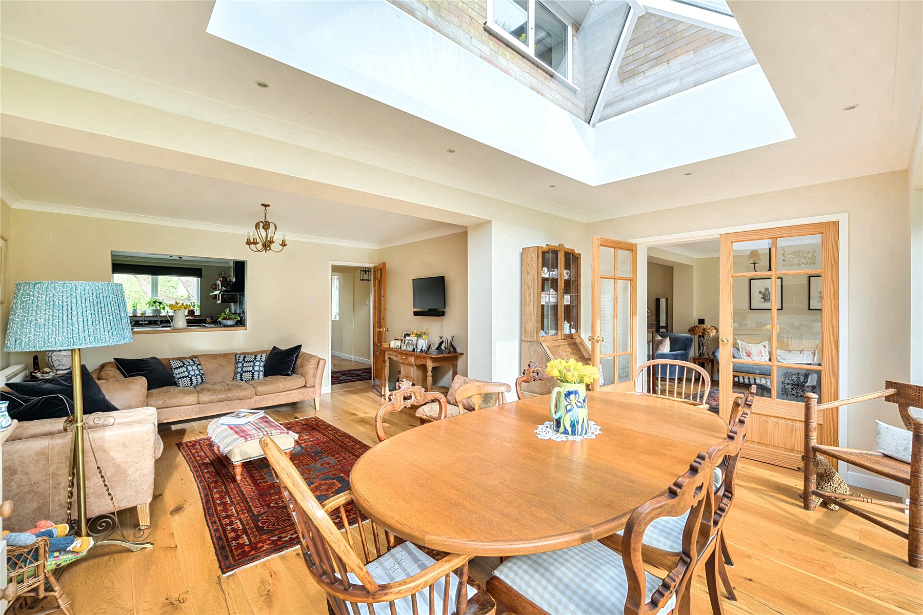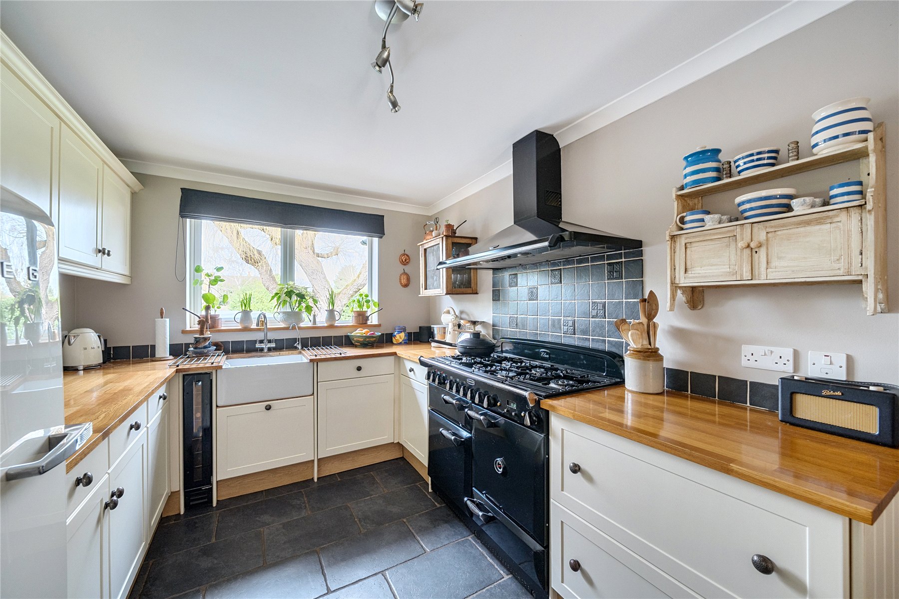 The separate dining room is a standout feature of the home, enhanced by a striking roof lantern and full-width bi-fold doors, seamlessly connecting indoor and outdoor spaces. These architectural additions flood the space and the adjoining reception area with natural light while creating an impressive setting for entertaining, effortlessly bringing the outside in. The kitchen is both practical and characterful, finished with a flagstone floor, solid wood worktops and a traditional Belfast sink. An external door leads to covered side access, connecting conveniently to the garage, a useful store and a separate utility room.