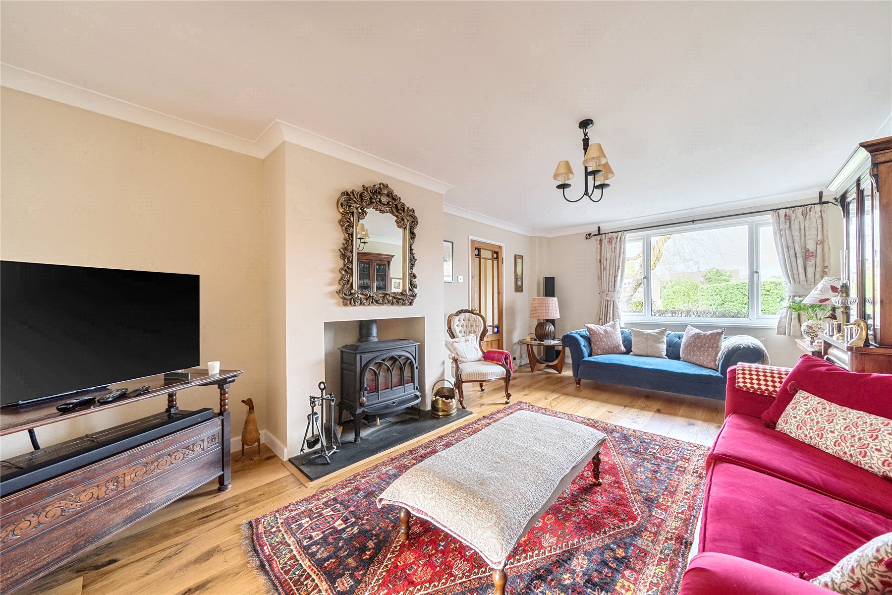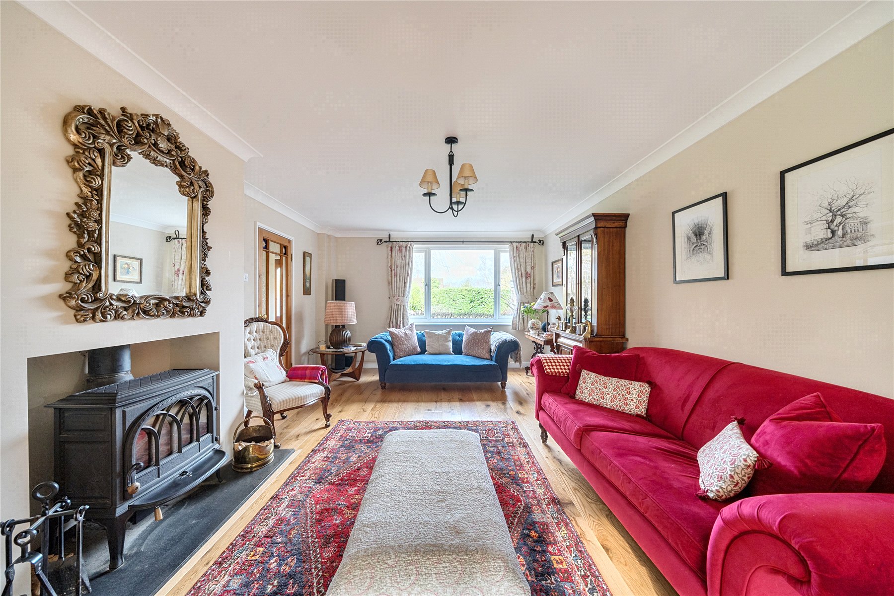 Upon entering, a light and welcoming hallway provides access to the principal reception rooms and a convenient ground floor WC. The generous sitting room forms a cosy yet elegant retreat, centered around a charming wood burning stove perfect for relaxing evenings. Complementing this is a bright and versatile family room, where bi-fold doors open directly onto the garden.