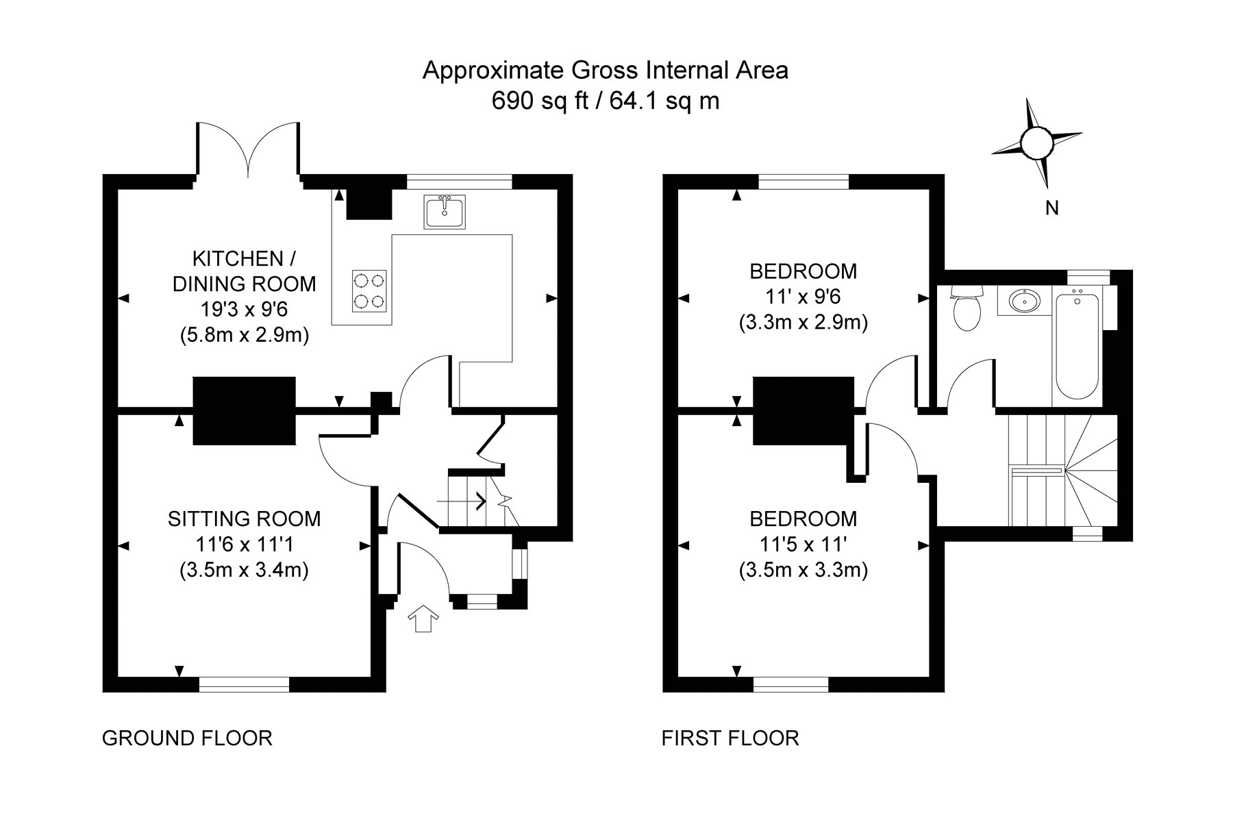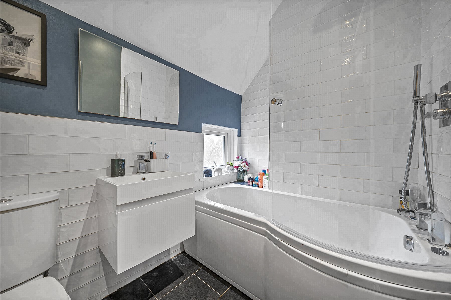 Beautifully presented throughout, the property offers two spacious double bedrooms and a modern family bathroom, fitted with a contemporary three-piece suite comprising a wash hand basin with vanity unit, WC, and P-shaped bath with wall-mounted shower.