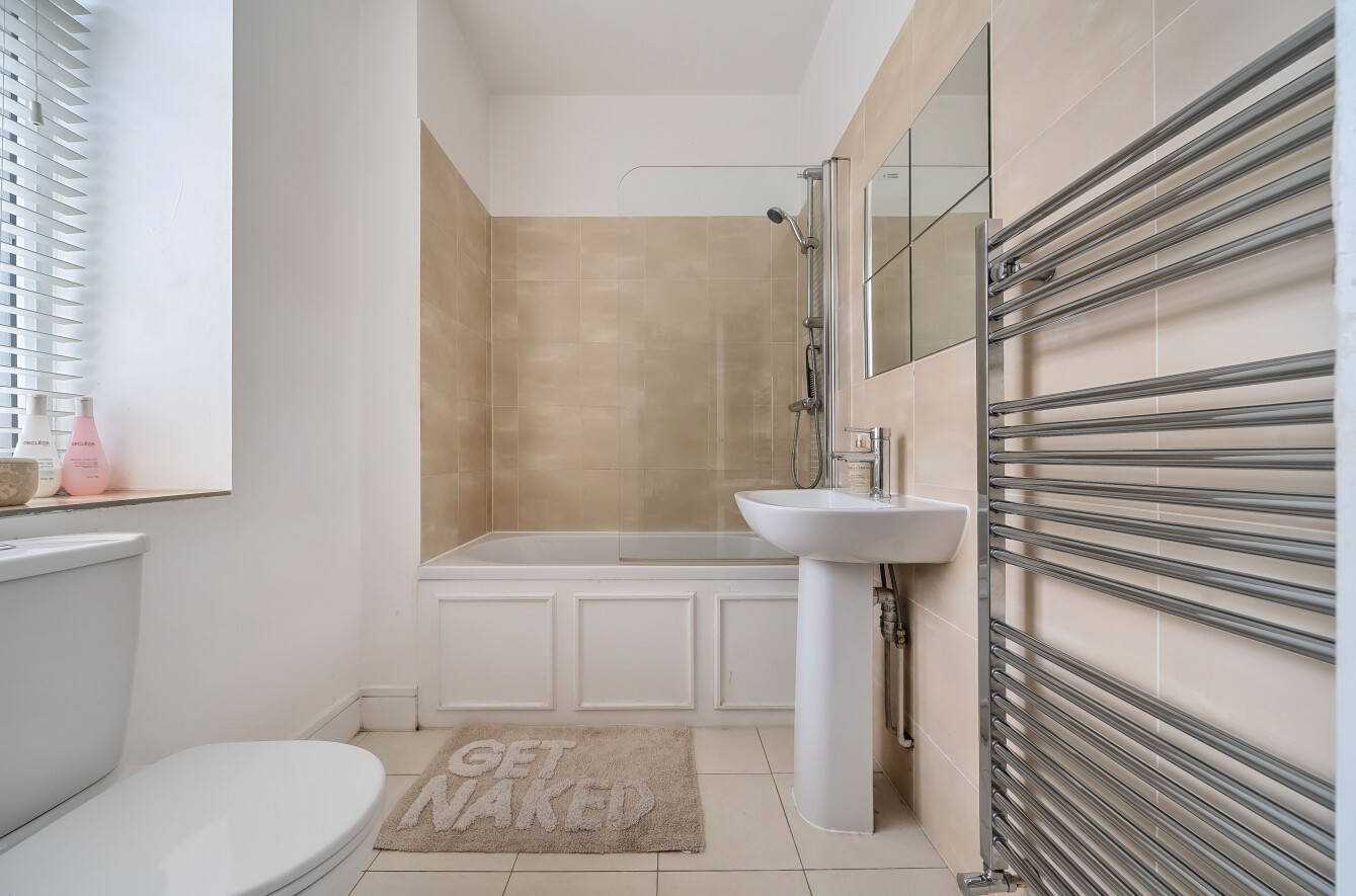 Tucked away behind the lounge Is a good sized double bedroom with door into a contemporary en suite bathroom with tiled flooring and part tiled walls. The white bathroom suite includes a shower over the bath and is complemented by a chrome heated towel rail.