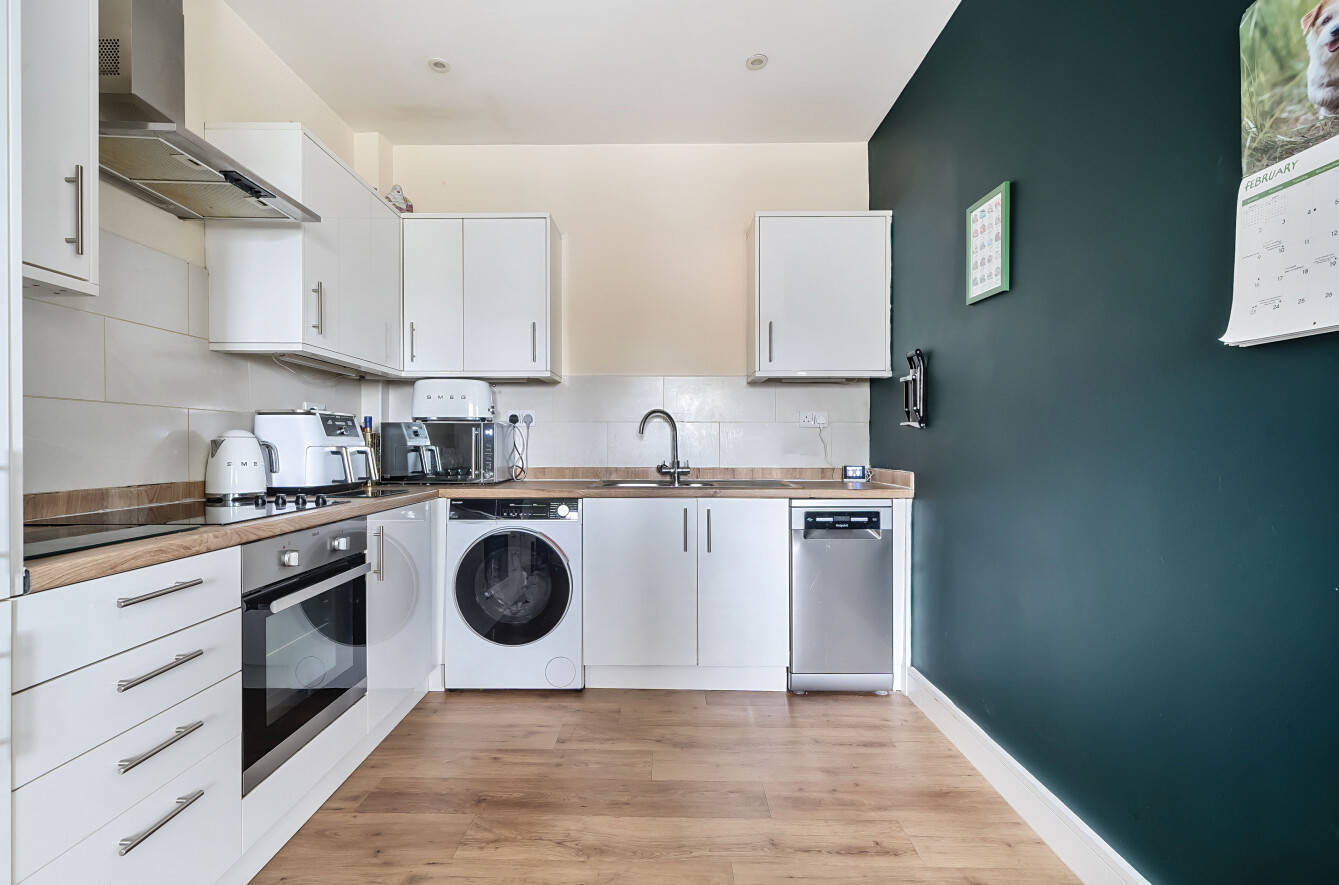 A communal entrance door leads to a hallway servicing just two flats. From here a private front door opens into a large L-shaped reception space, with the lounge area open plan to the kitchen at the far end. There is hard flooring throughout and two large windows providing plenty of natural light. The kitchen is modern and fitted with a range of stylish white drawers and cupboards with integrated oven and hob, plus space and plumbing for a dishwasher and washing machine.
