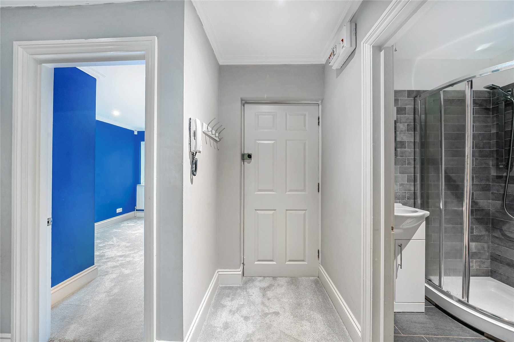 Secure entry phone systems allows access into a wide communal hallway with staircase to the end