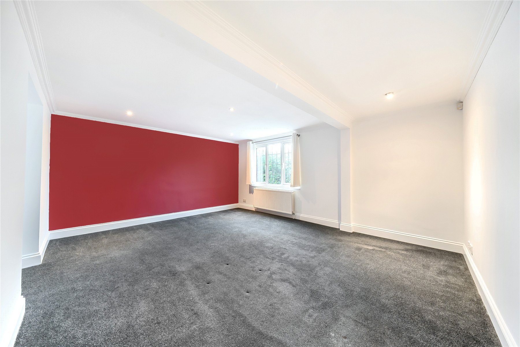 Large double aspect living room with access into a modern fitted kitchen
