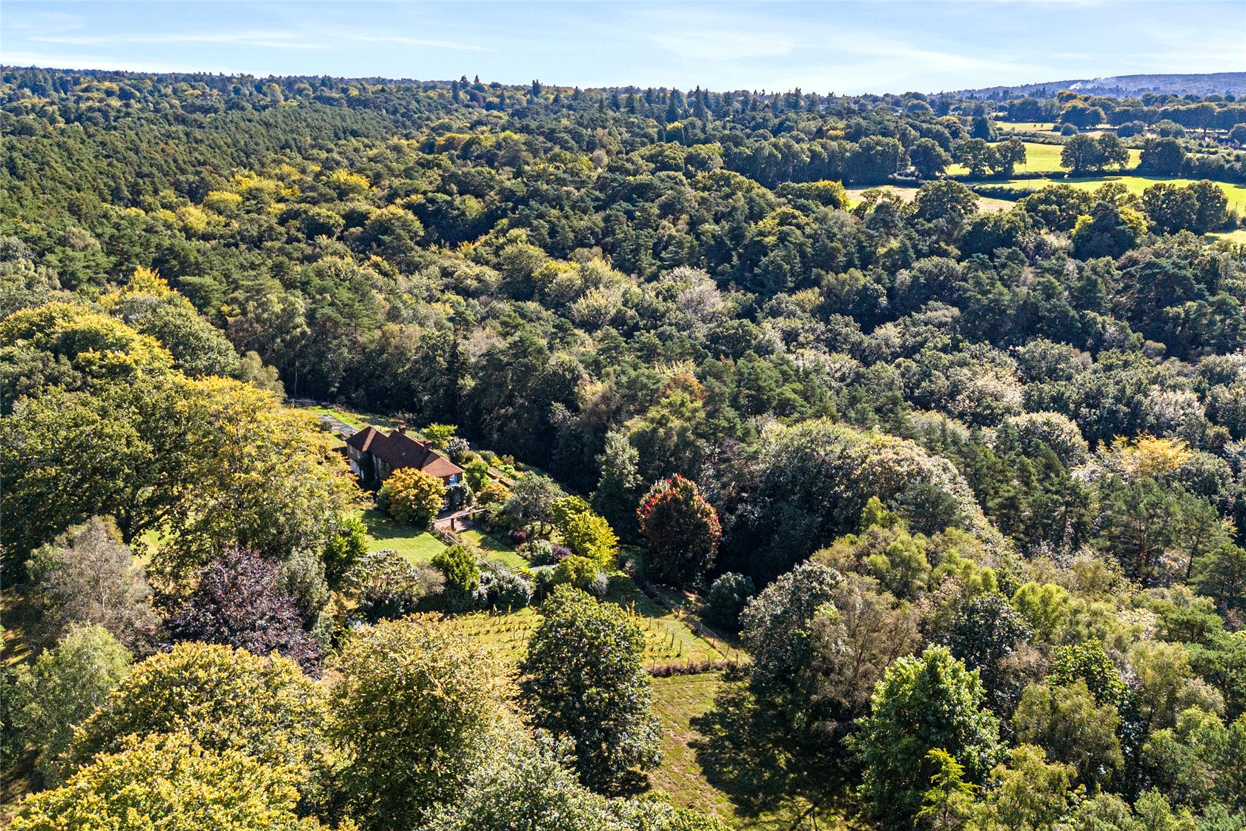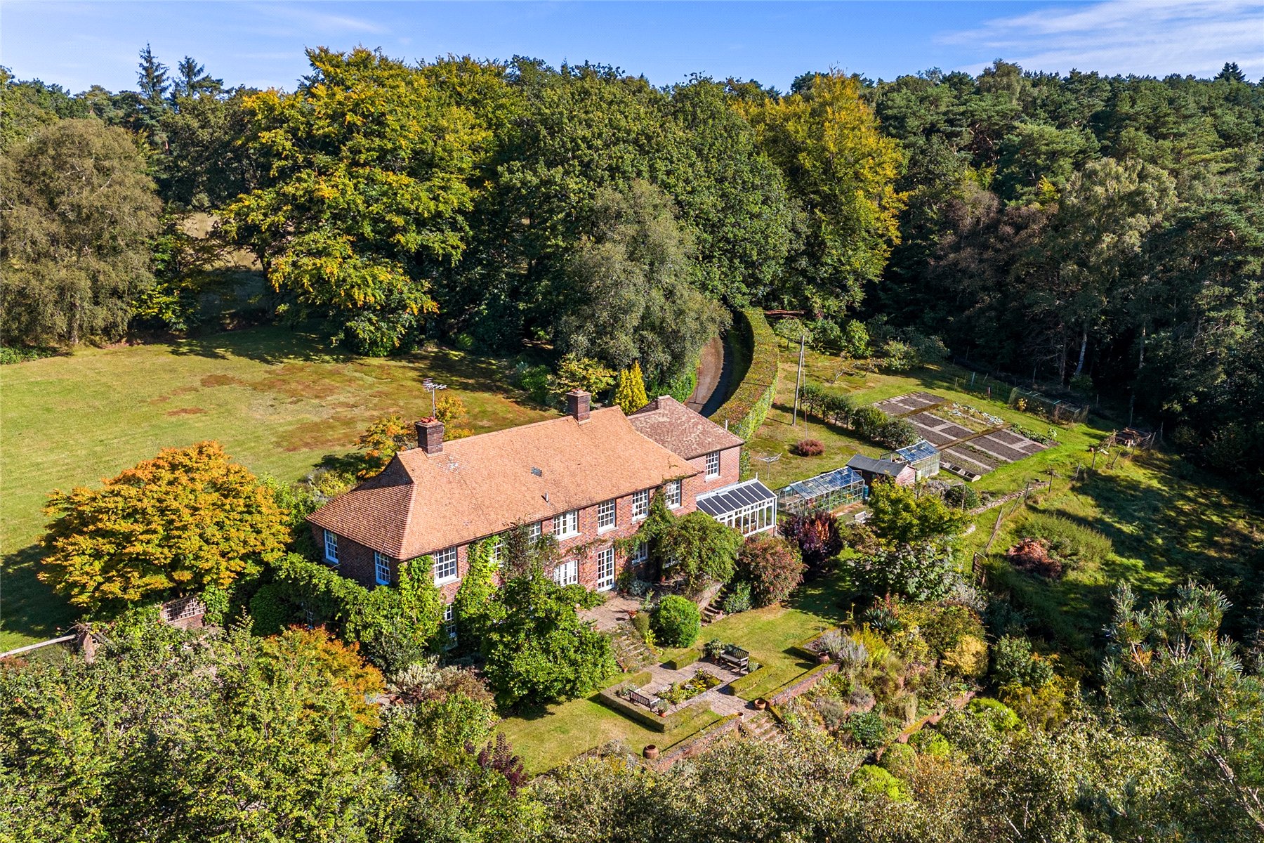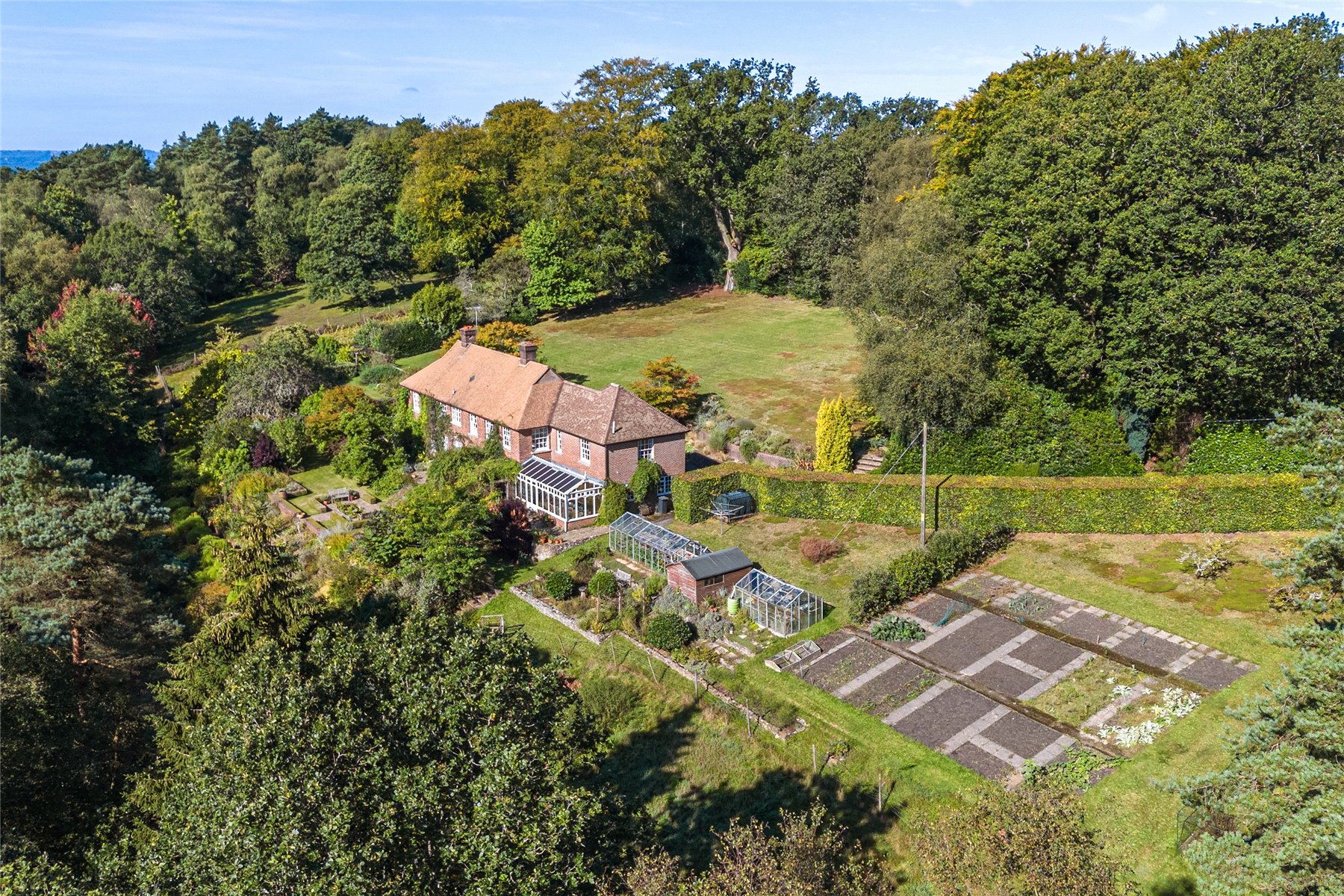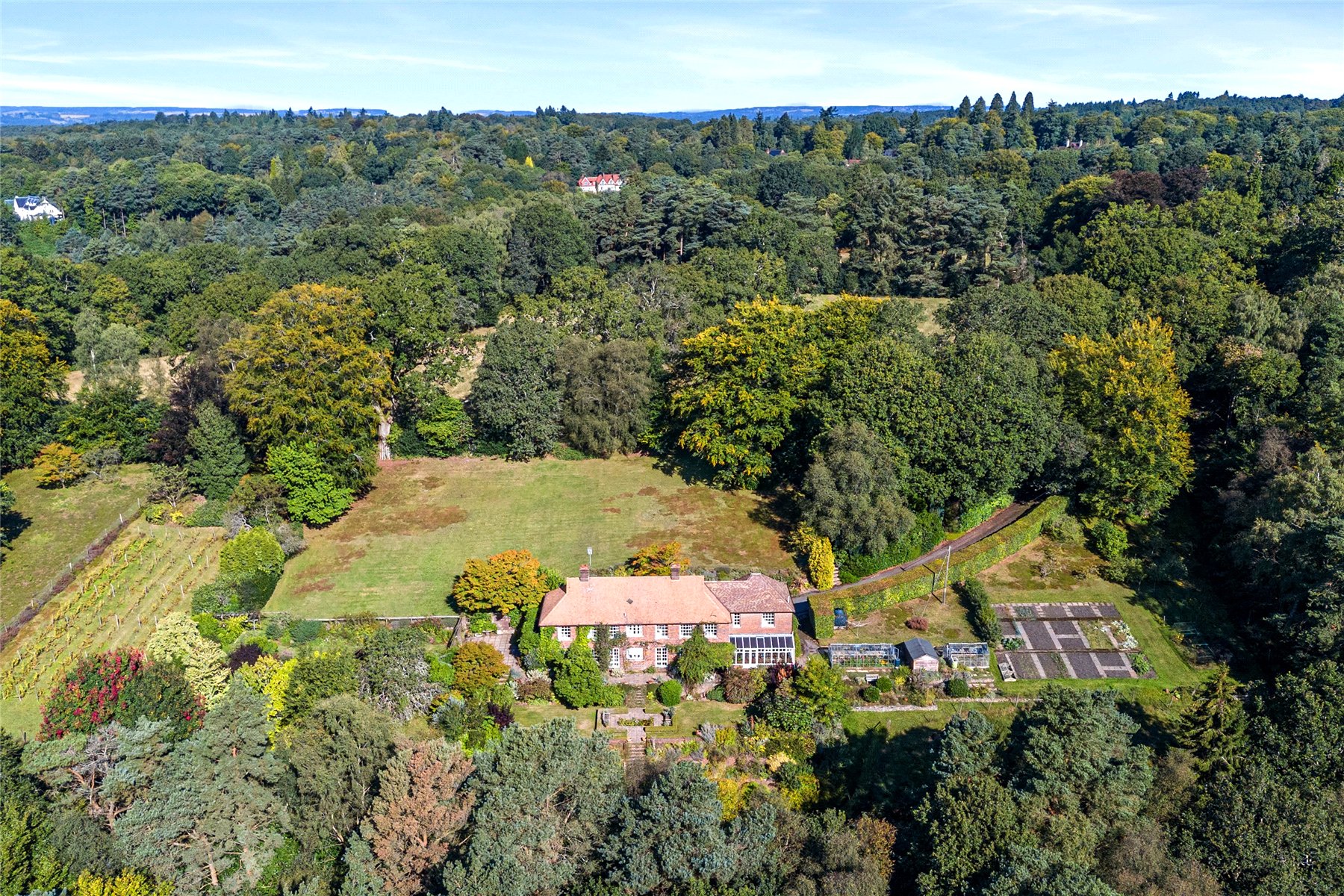 This unique home enjoys a tucked away position at the end of the highly desired Kingswood Firs area of Grayshott, approached by a winding driveway through it's own land to emerge in front of the house. The land envelopes the house on all side with a mixture of formal gardens, paddock, orchard, vineyard and private woodland, all of which enjoys a backdrop of National Trust woodland.