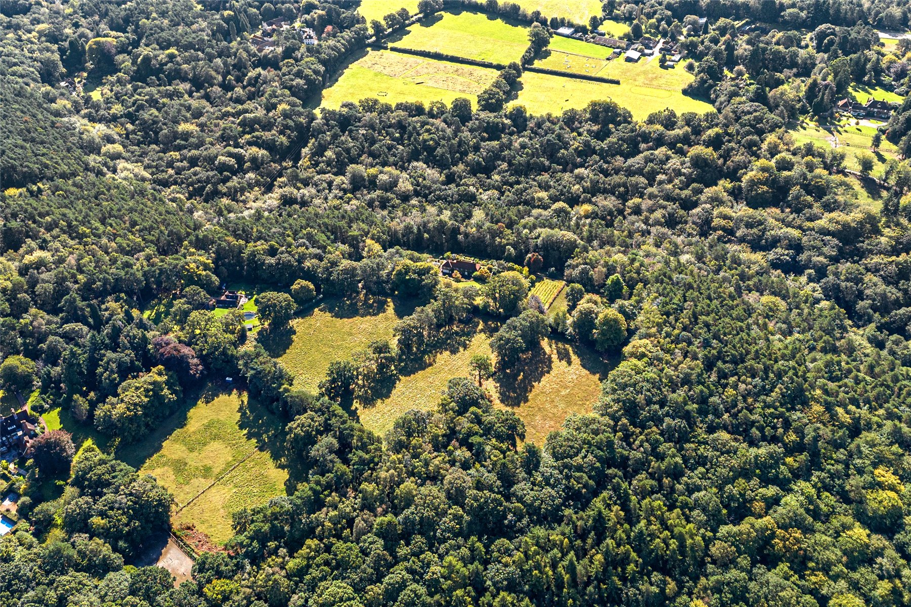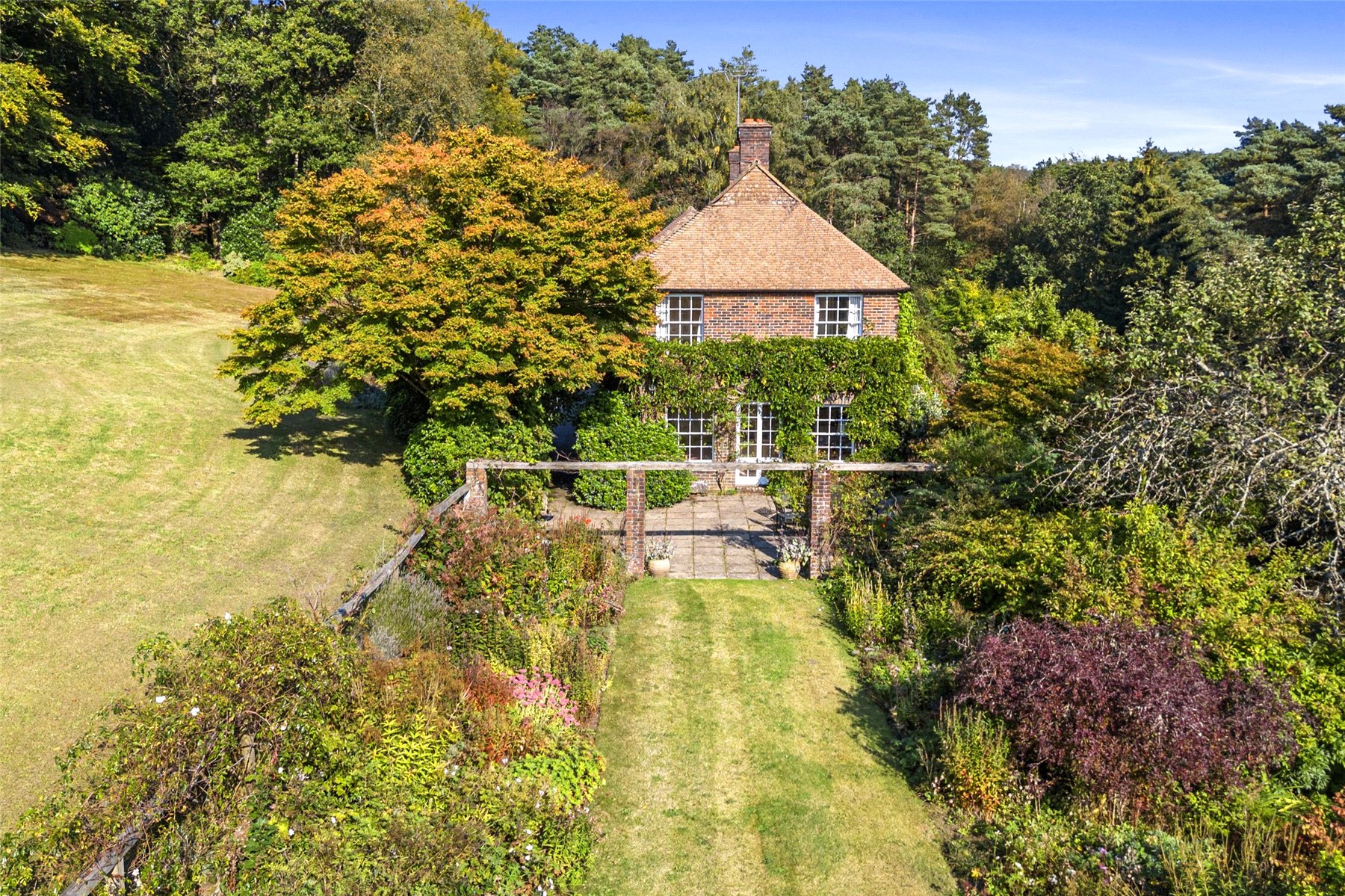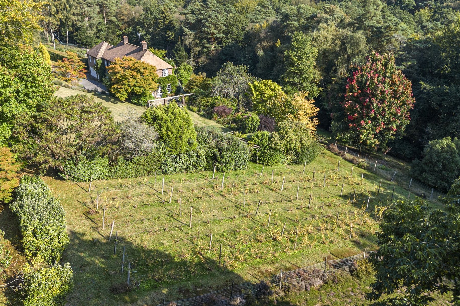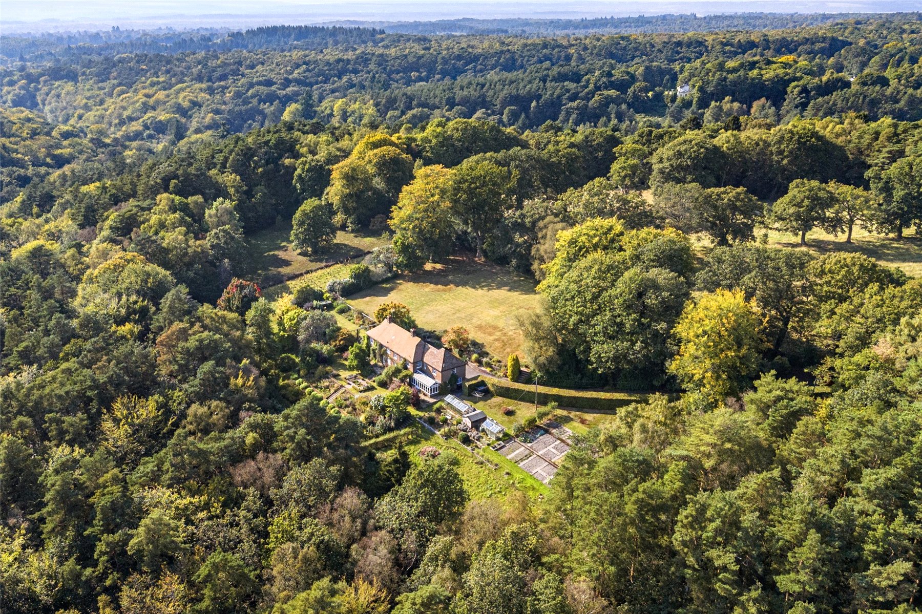 This unique home enjoys a tucked away position at the end of the highly desired Kingswood Firs area of Grayshott, approached by a winding driveway through it's own land to emerge in front of the house. The land envelopes the house on all side with a mixture of formal gardens, paddock, orchard, vineyard and private woodland, all of which enjoys a backdrop of National Trust woodland.
