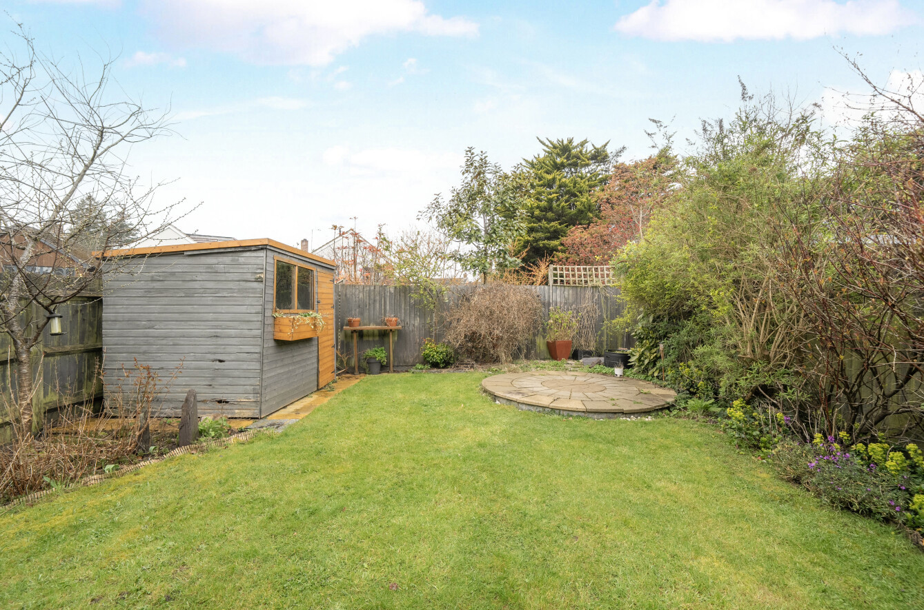 Mature shrubs and hedging screen the front garden and the house from neighbours (with a cream magnolia providing lovely colour in Spring). To one side is a lawn area, to the other driveway parking for 2 vehicles leading up to garage
